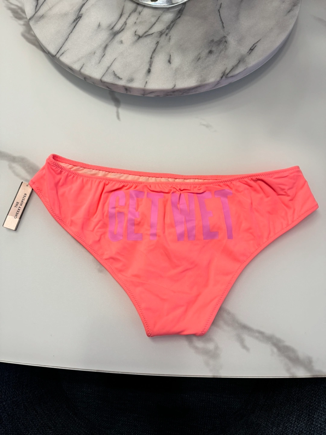 Coral pink bikini bottom. Medium size. New with tags. 'Get Wet' graphic on back. Retails for $24. Pickup is on 72nd and 1st in Manhattan. Preference given to whoever schedules pickup first.