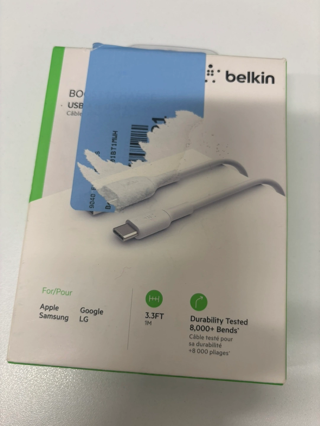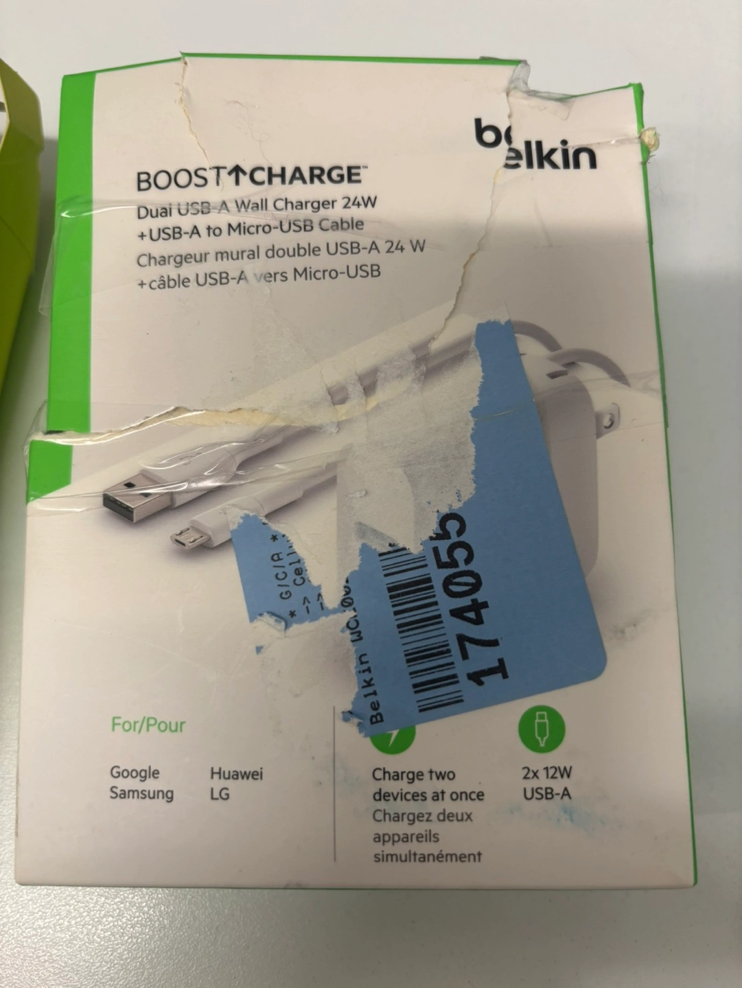 Three different charging cables and a Belkin wall charger. One Onn. USB-C to Lightning cable, one Belkin USB-C cable, and one pink USB-A to Lightning cable. Belkin Boost↑Charge 24W Dual USB-A to Micro-USB wall charger included. Cables vary in length.