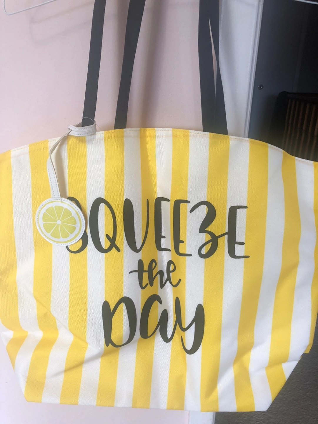 Large yellow and white striped tote bag. Features black straps and the phrase "Squeeze the Day" printed on the front. Lemon charm included.