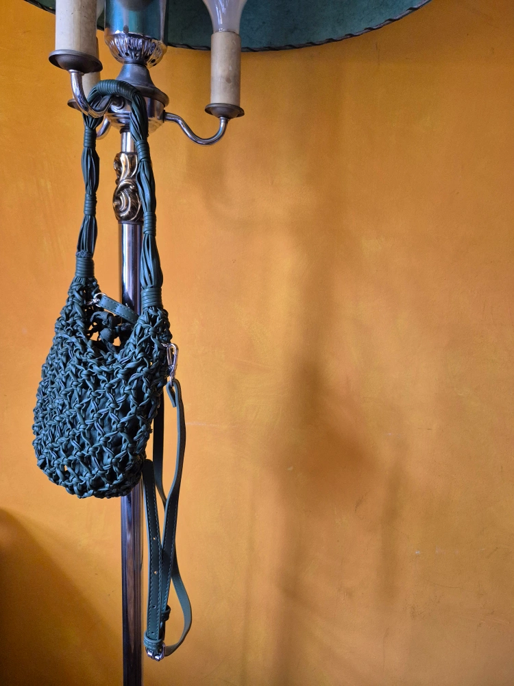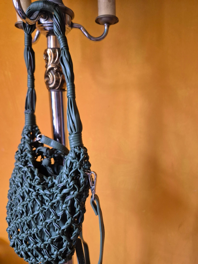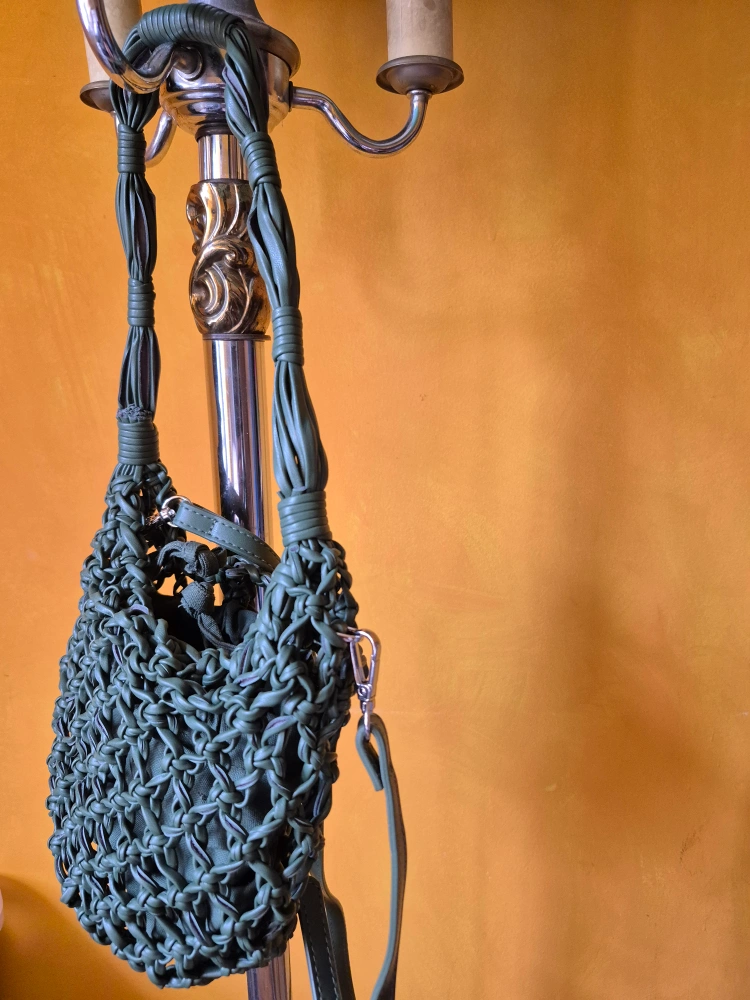 Unique olive green knitted handbag. Features a braided top handle and detachable shoulder strap. Small, lightweight design. Perfect for summer outings
