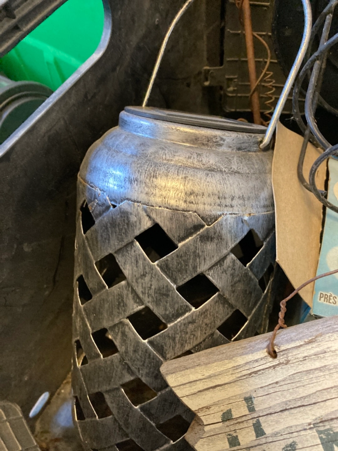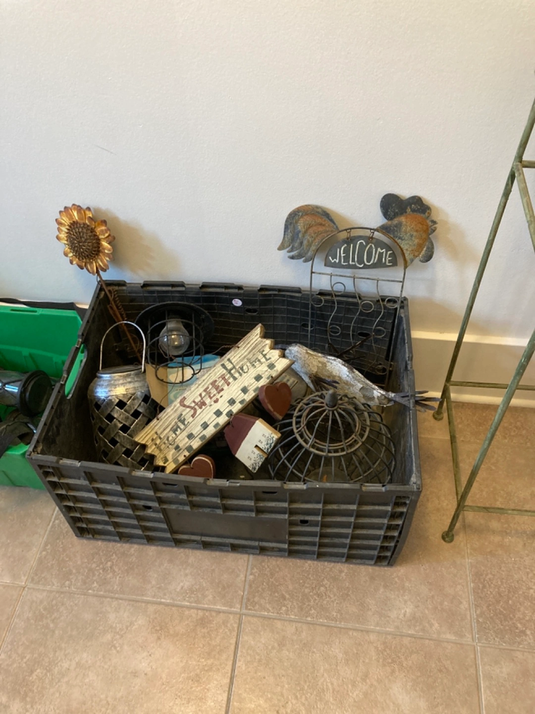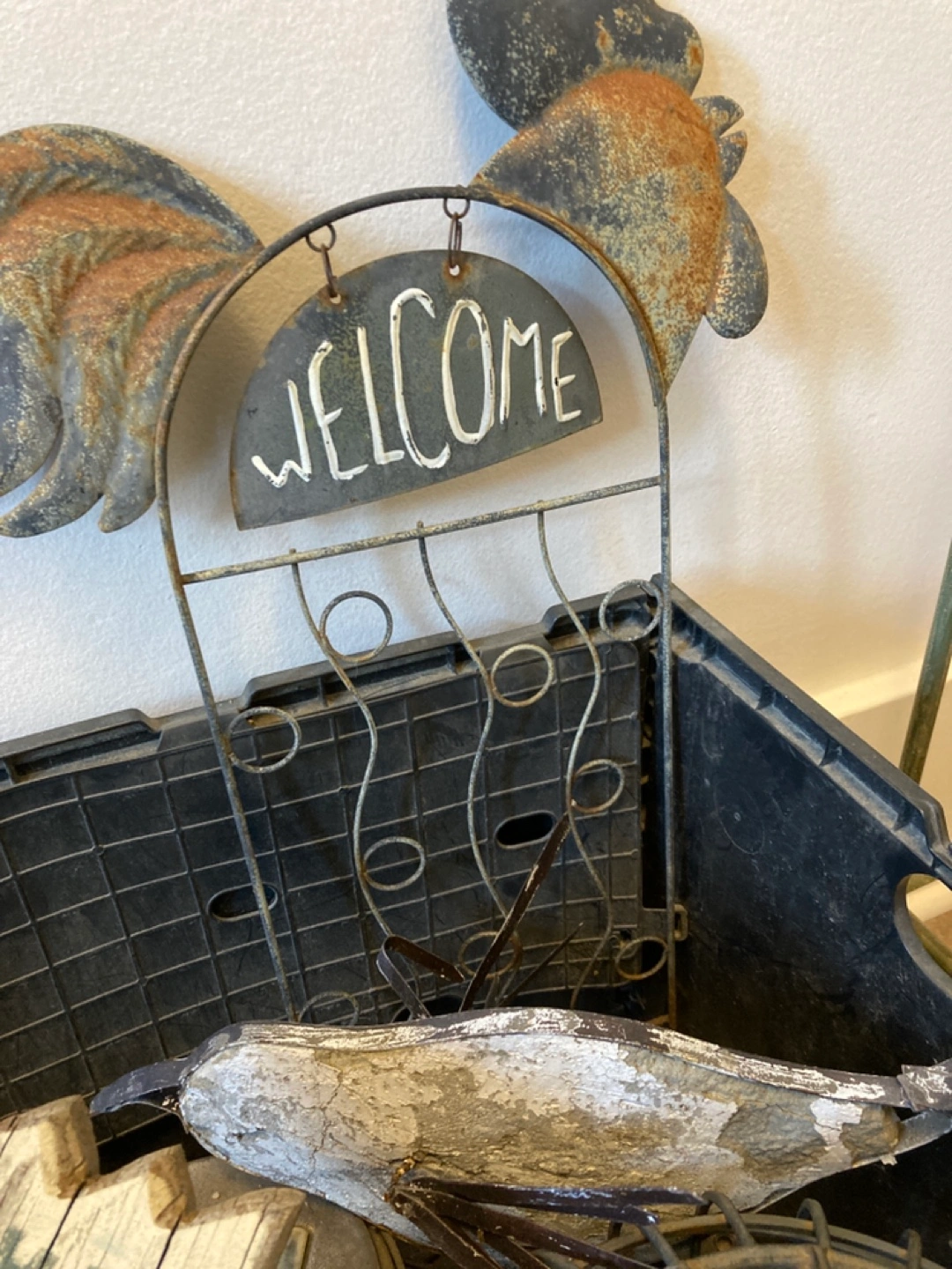Assortment of rustic and farmhouse decor items. Includes metal lanterns, welcome sign, rooster figurines, and wooden signs. Some items show signs of wear consistent with age and use. Great for adding character to your home.