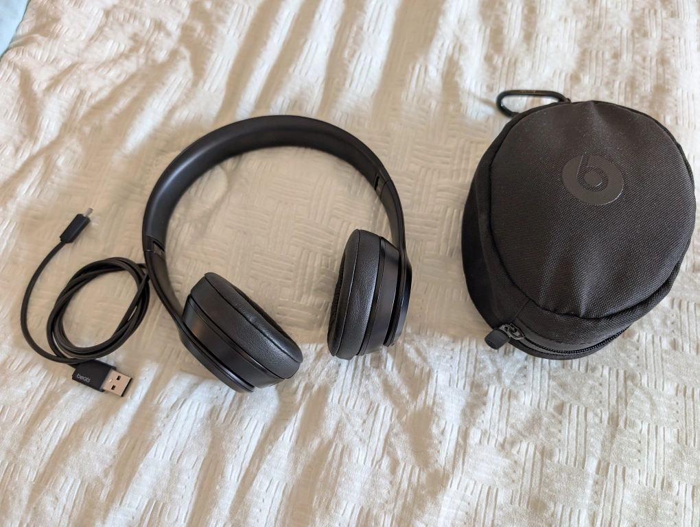 Black Beats Solo3 Wireless headphones. Includes charging cable and carrying case. Excellent sound quality. Great for travel.
