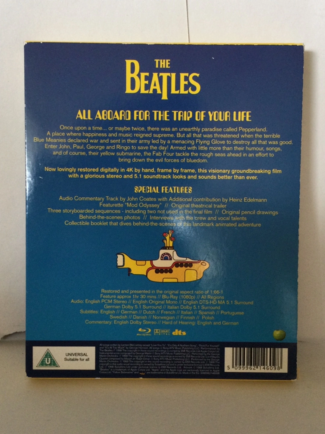 Blu-ray disc of The Beatles' Yellow Submarine. Features restored stereo and 5.1 soundtrack. Includes commentary track, original theatrical trailer, and more. Collectible booklet included.