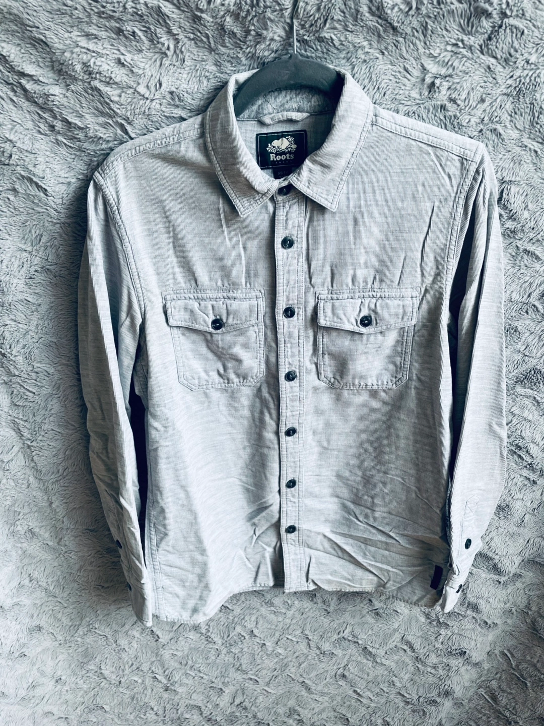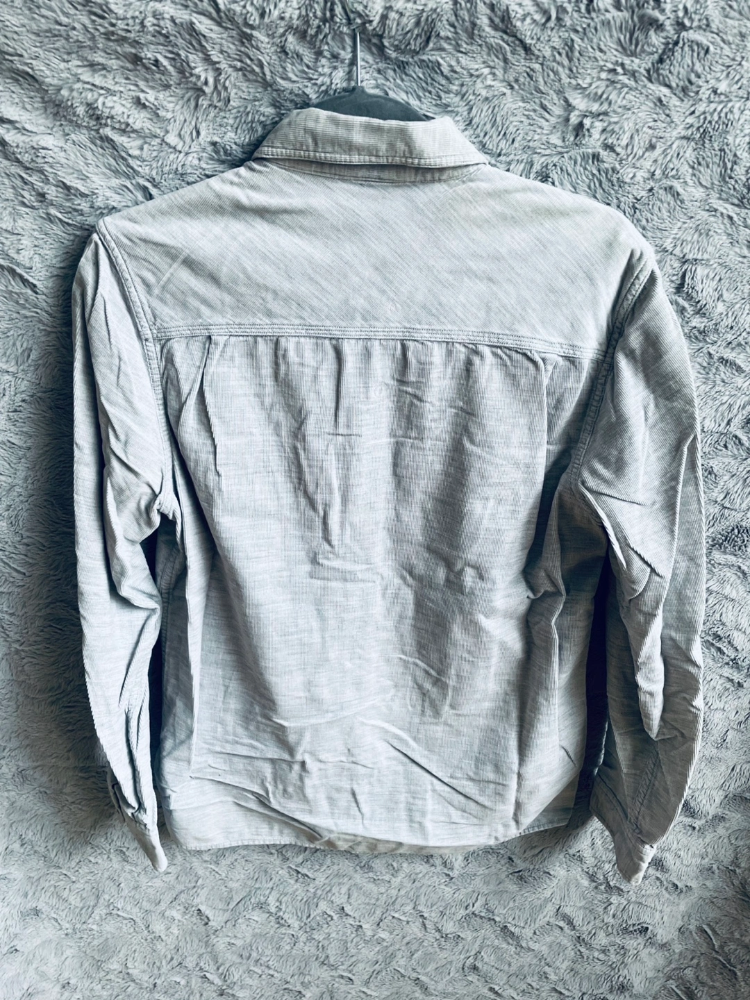 Long-sleeve button-up shirt. Light grey corduroy. Two chest pockets. Size XS.