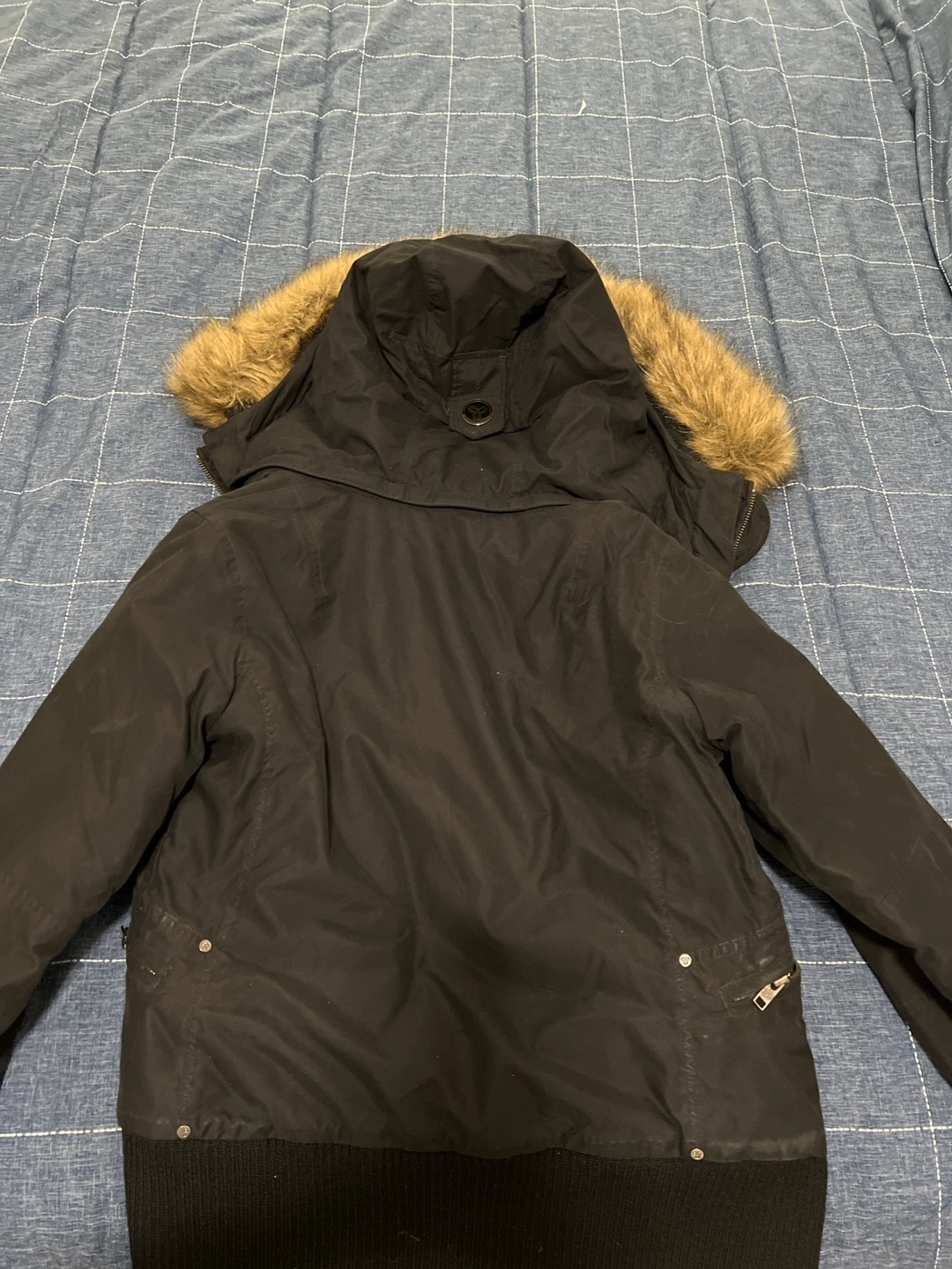 Women's black winter jacket. Features a faux fur-lined hood, zipper closure, multiple pockets, and ribbed cuffs. Great for cold weather. Mint condition
