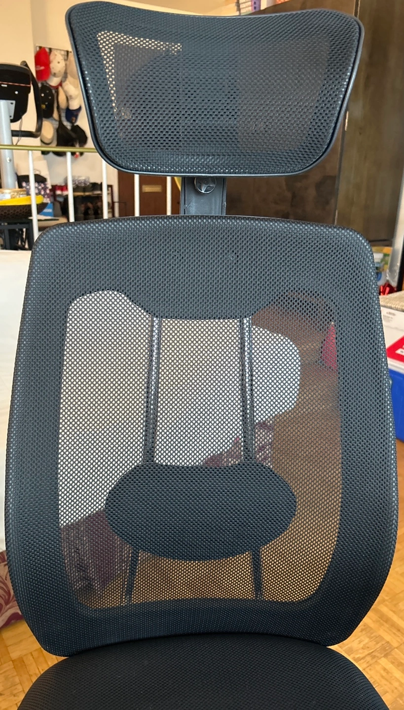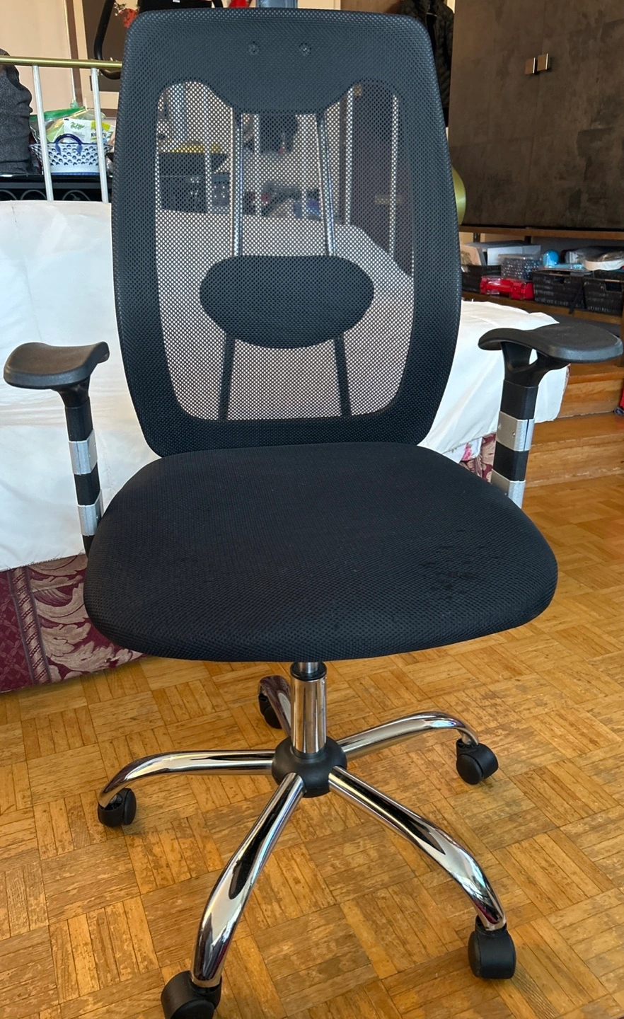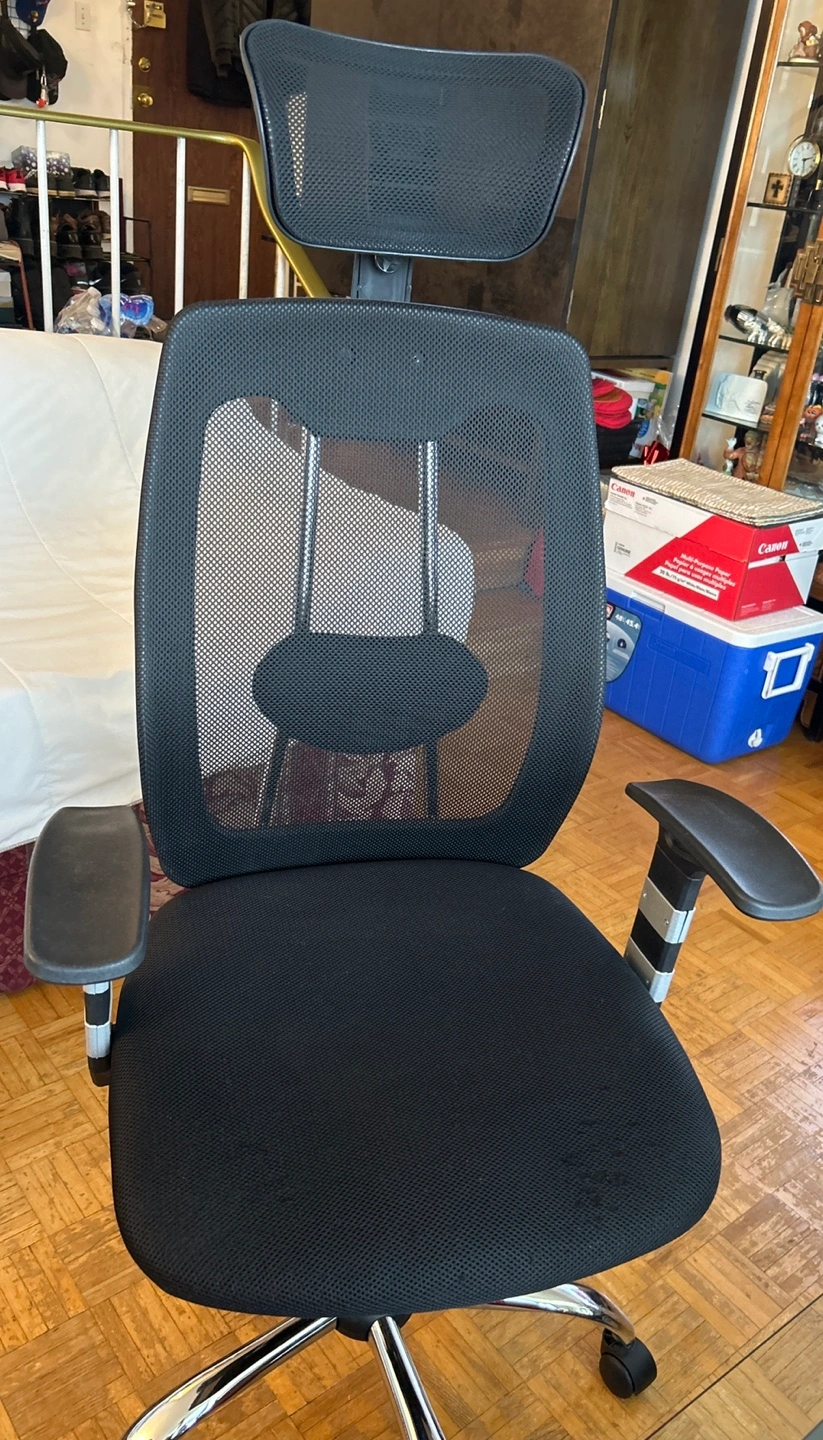 1000+Black mesh office chair. Adjustable height and lumbar support. With arms and mesh headrest included. Chrome base. Excellent quality and design. Some minor wear on the front part of the seat only, as seen in the picture. The rest of the chair is in great condition. Clean and ready to use. Smoke/Pet free home. Cash & Pick up only.