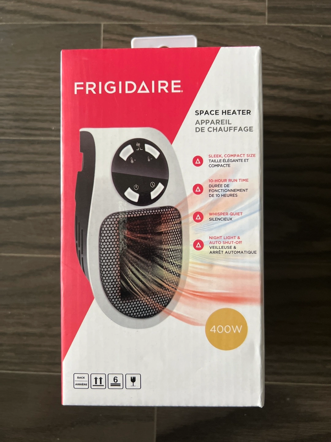 New Frigidaire space heater. 400 watts. Sleek and compact design. 10-hour run time. Whisper quiet operation. Night light and auto shut-off features. Perfect for small spaces.