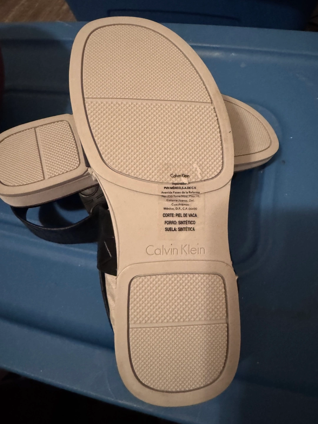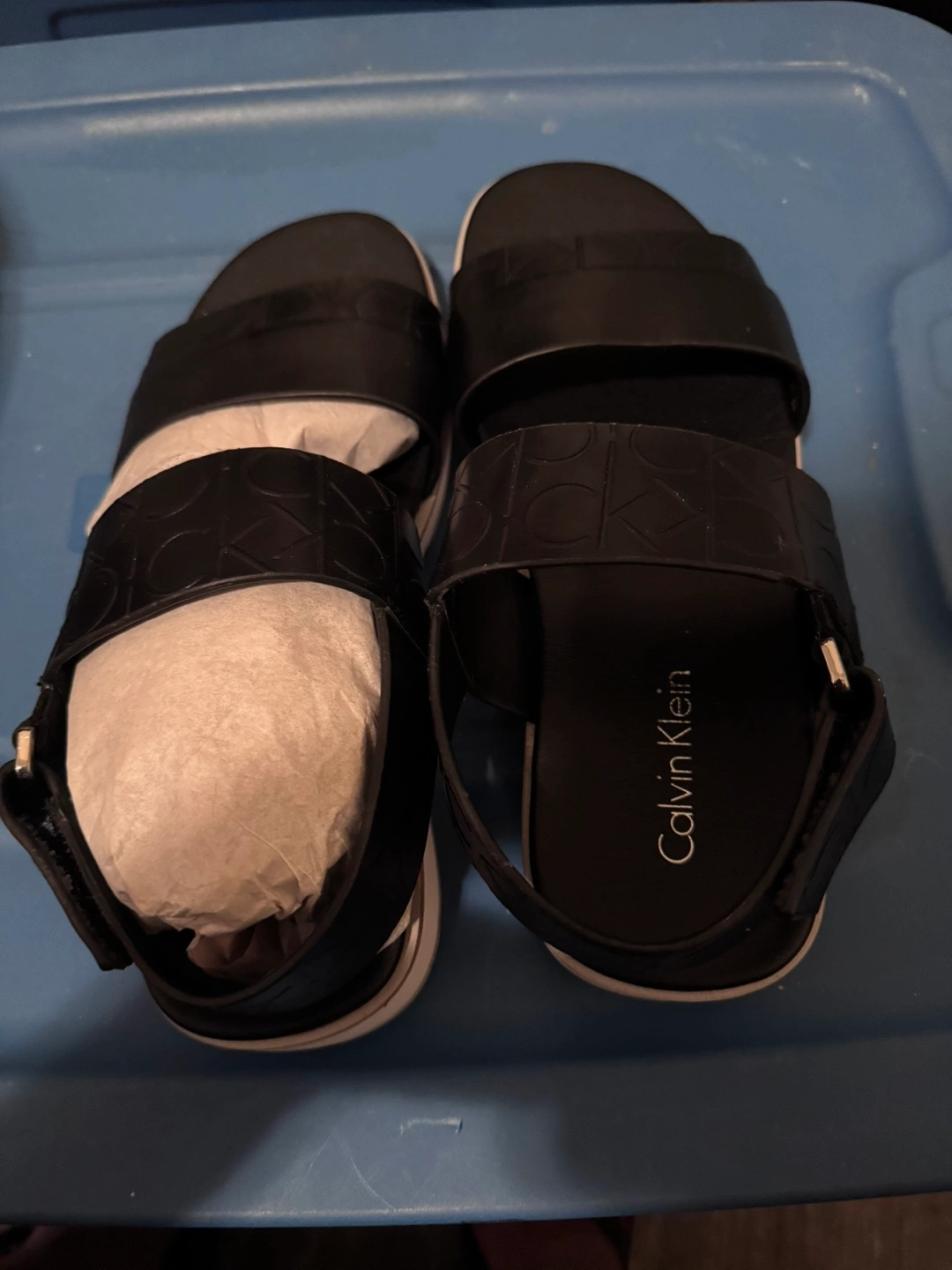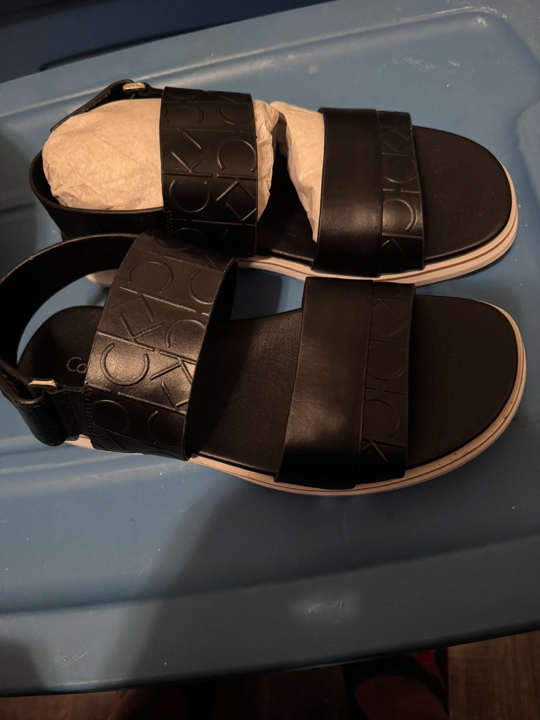 Black leather platform sandals. Two straps with embossed CK logo. White platform sole. US Size 7.50. Made in China.