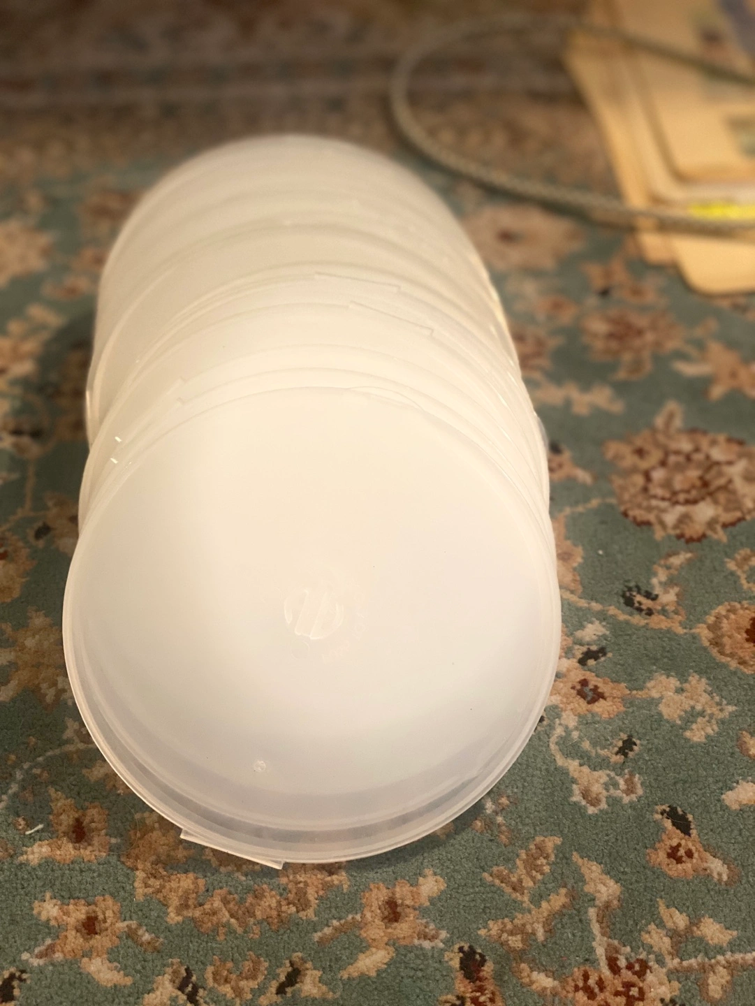 Multiple stackable, translucent, round containers. Perfect for organizing small items or crafts. Each container includes a matching lid. Great for storage.