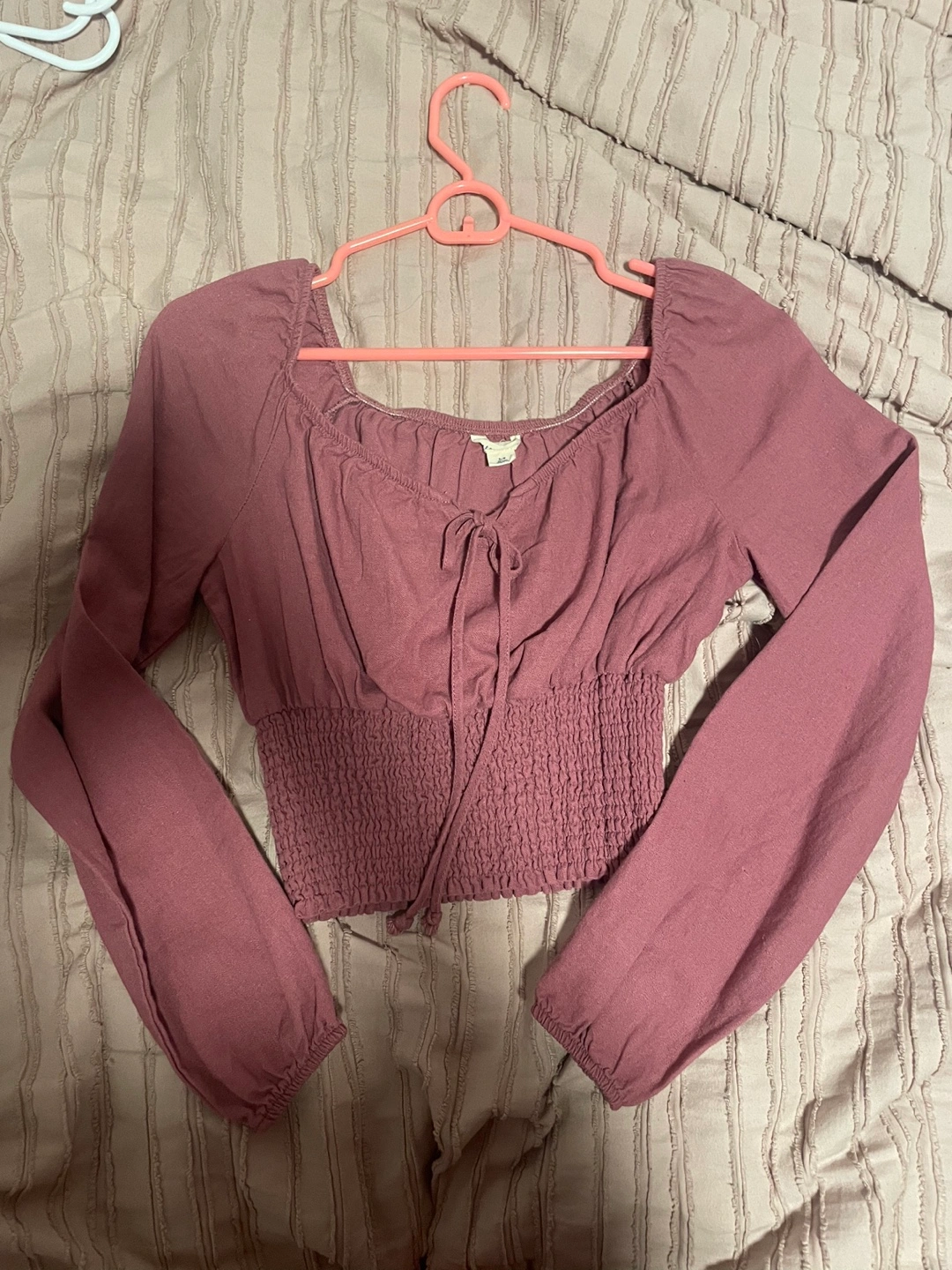 Women's dusty rose crop top. Long sleeves, square neckline, fitted bodice. Elasticated waist. Drawstring detail at the neckline. never worn
