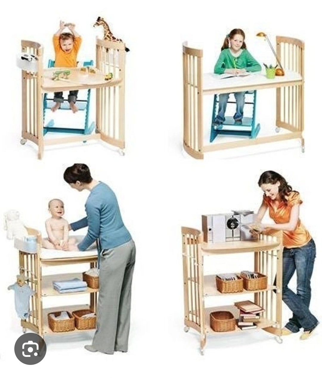 Multi-functional baby changing table. Converts to a child's desk. Features include a changing mat area, shelving and storage. Dark brown wood finish. Some minor wear.