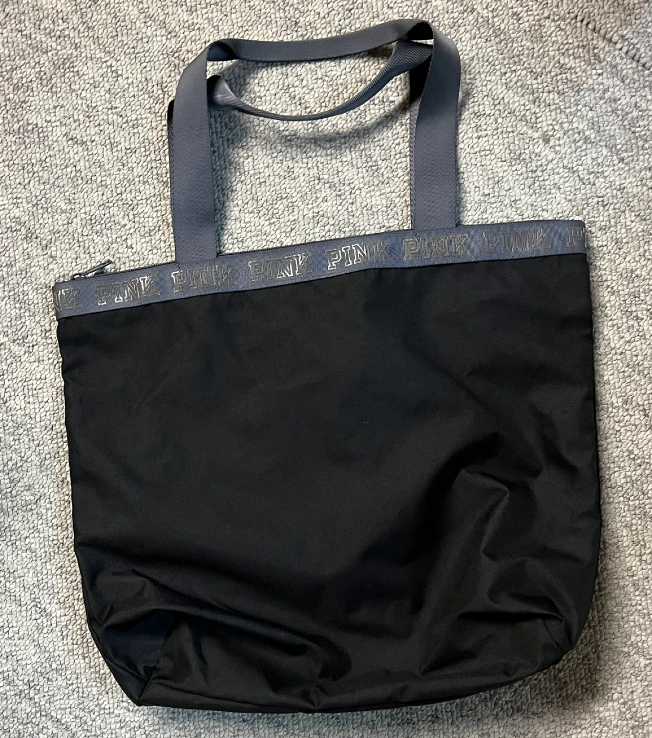 Black tote bag. Features grey straps and a zipper closure. Sequined PINK logo on the front. PINK branding on the top trim.