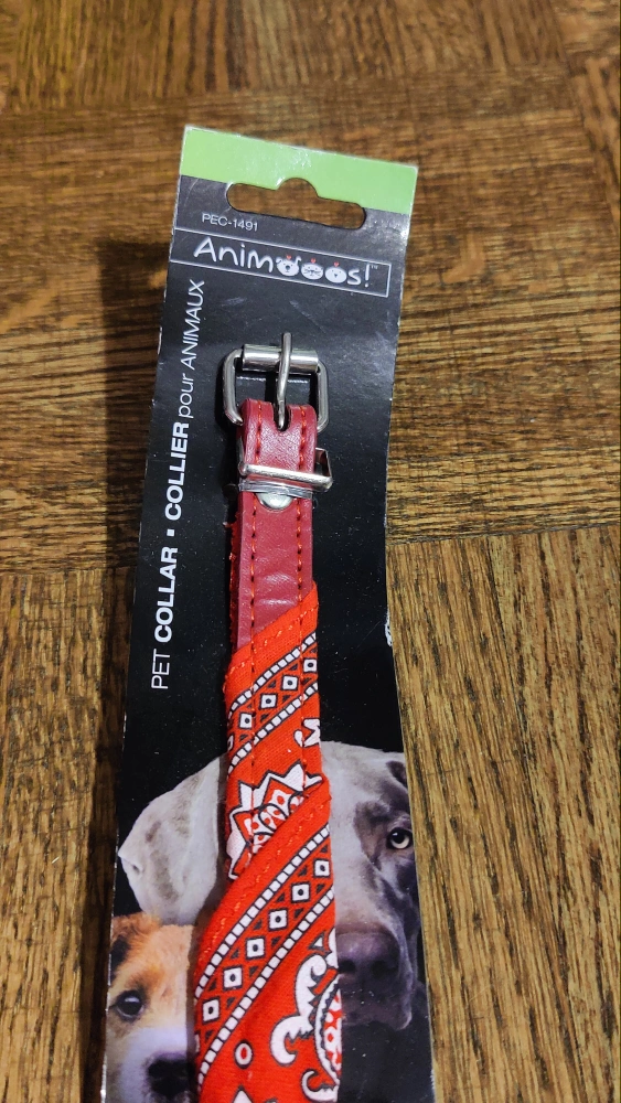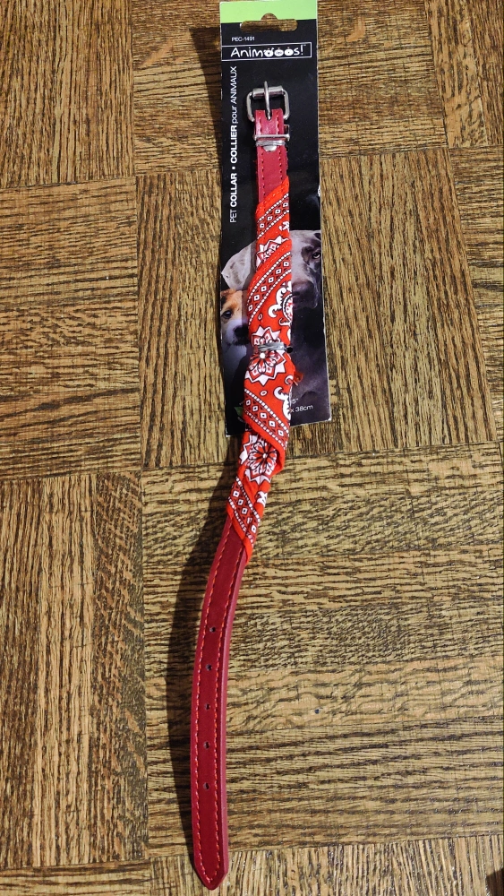 Red leather pet collar. Features a red bandana. Size: 38cm. New with tag. Great for small to medium dogs.