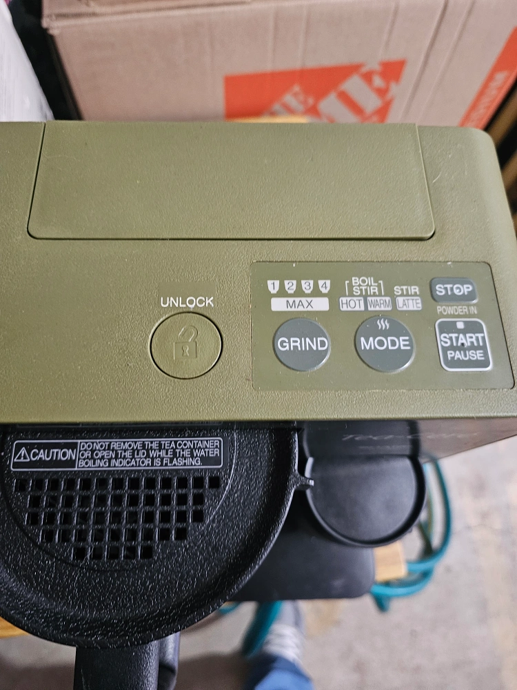 Used Sharp Tea-Ceré TE-T56U-GR tea maker. Some parts disassembled. Model number TE-T56U-GR. Includes water reservoir, tea container, and control panel. Good condition, some minor cosmetic wear.