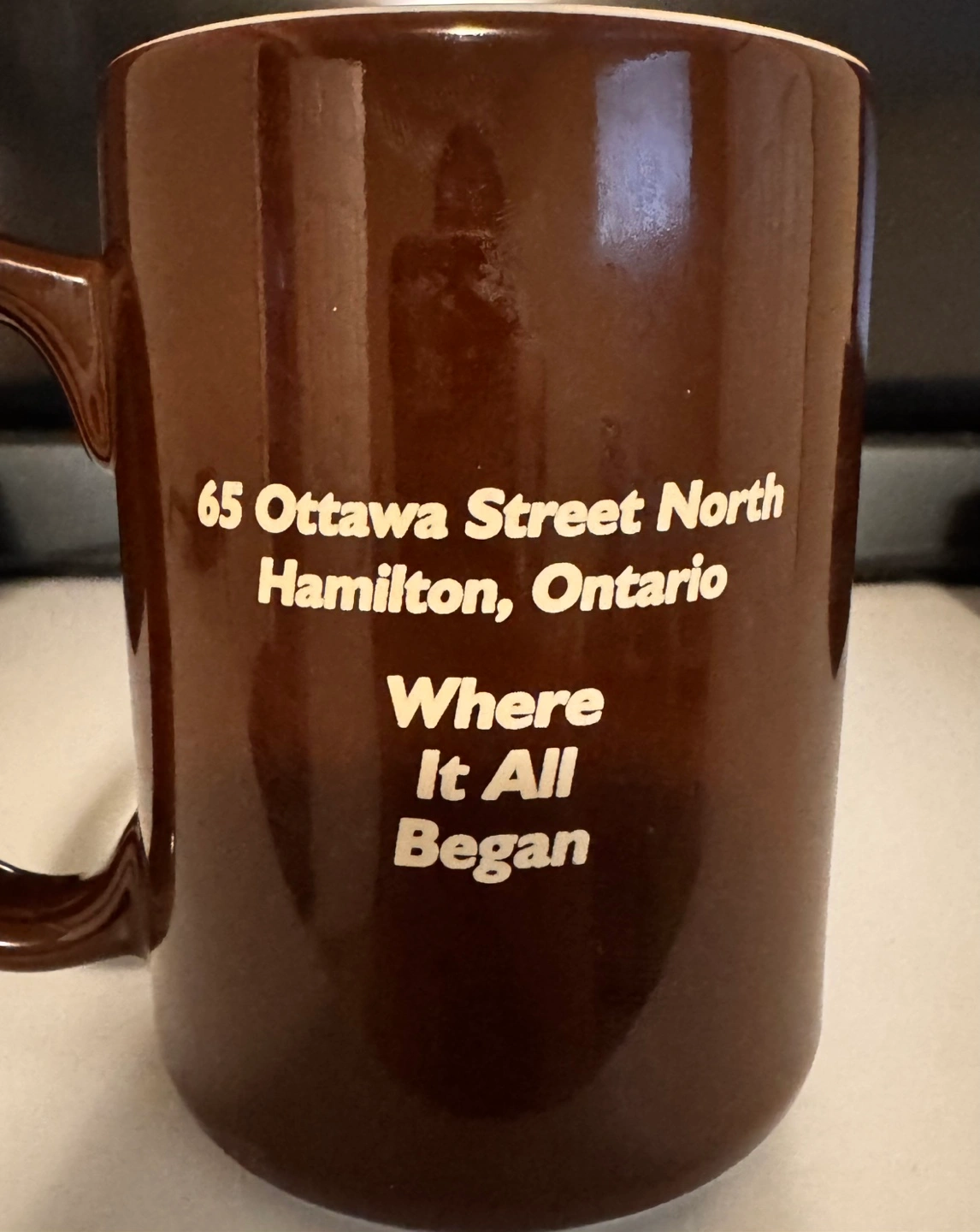 Brown Tim Hortons mug. Features vintage Tim Hortons logo and text. Back of mug reads "65 Ottawa Street North Hamilton, Ontario Where It All Began". Collectible. Never used.