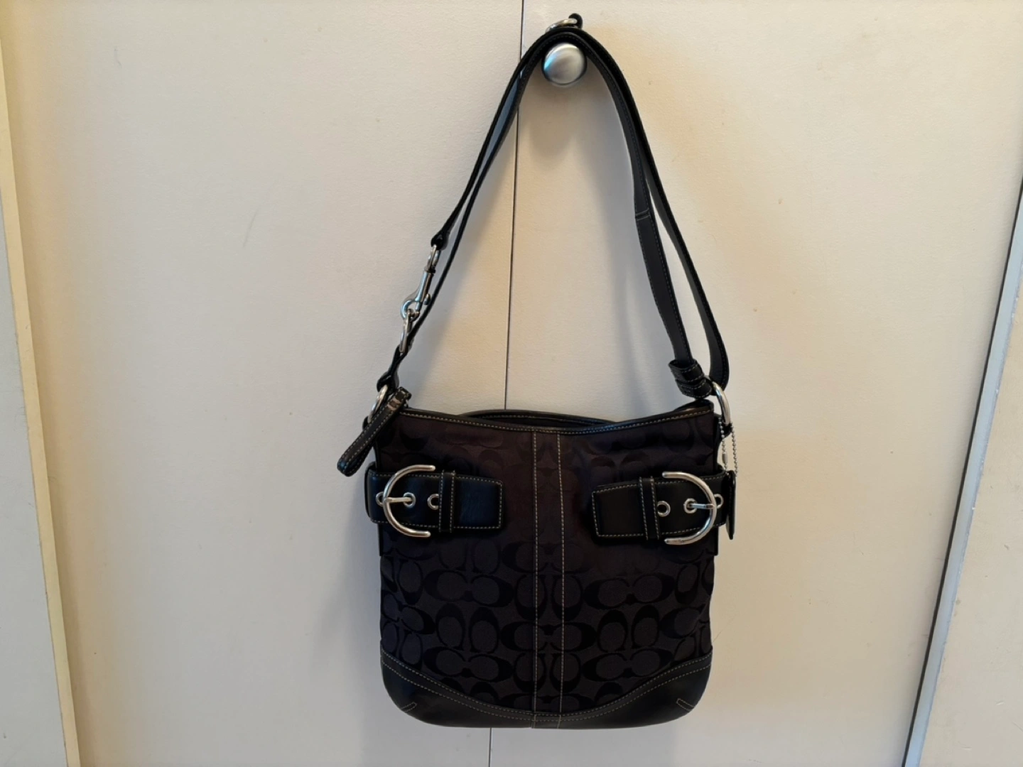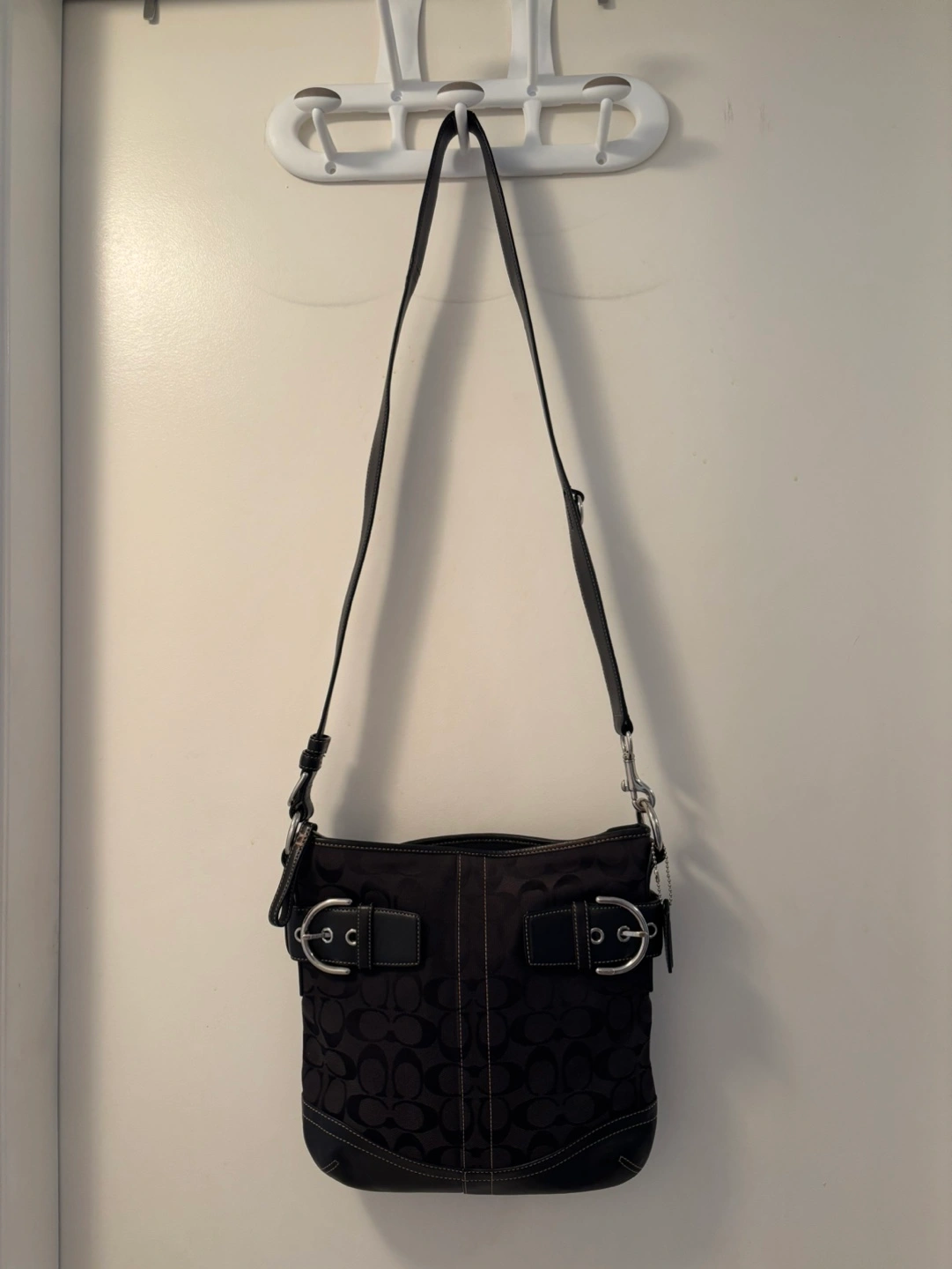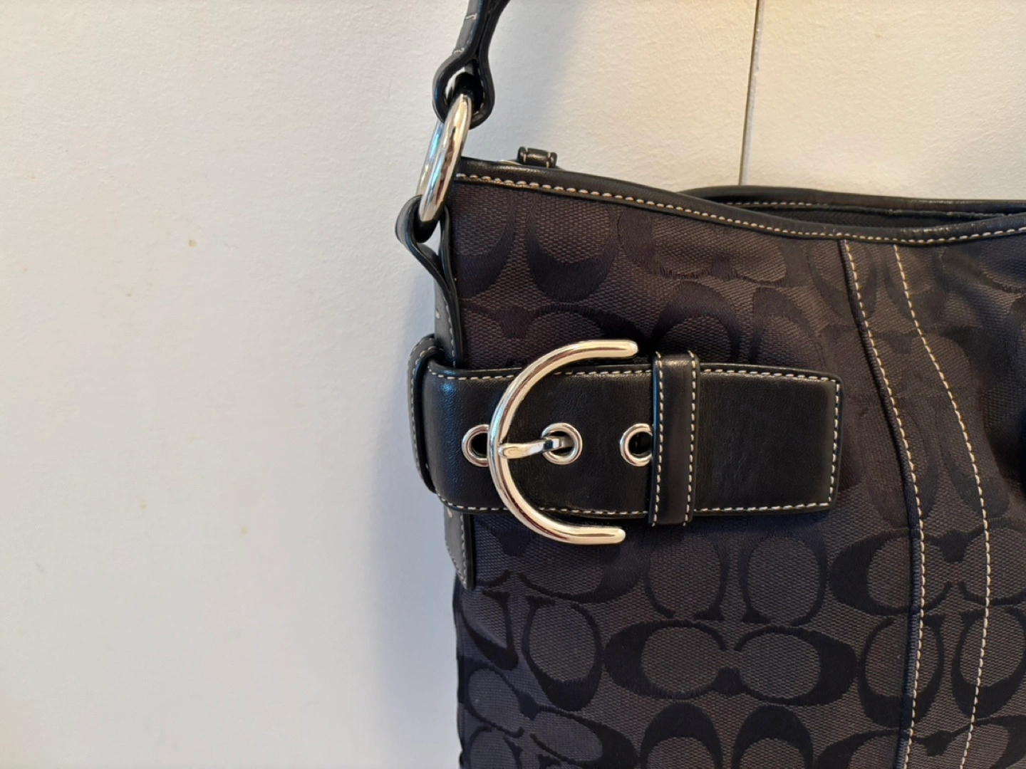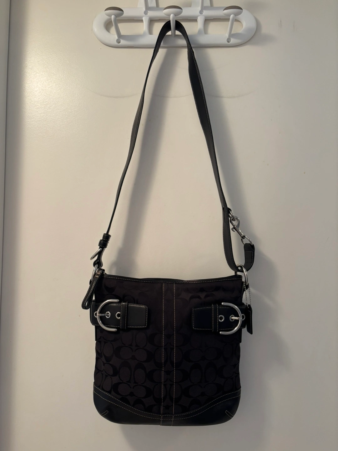 Black Coach shoulder bag. Features signature C canvas, leather trim, and silver-toned hardware. Three different lengths adjustable strap. Buckle detailing. Pre- owned. Excellent condition.