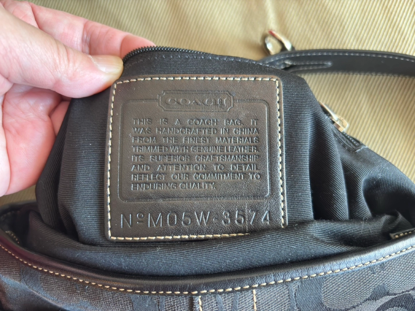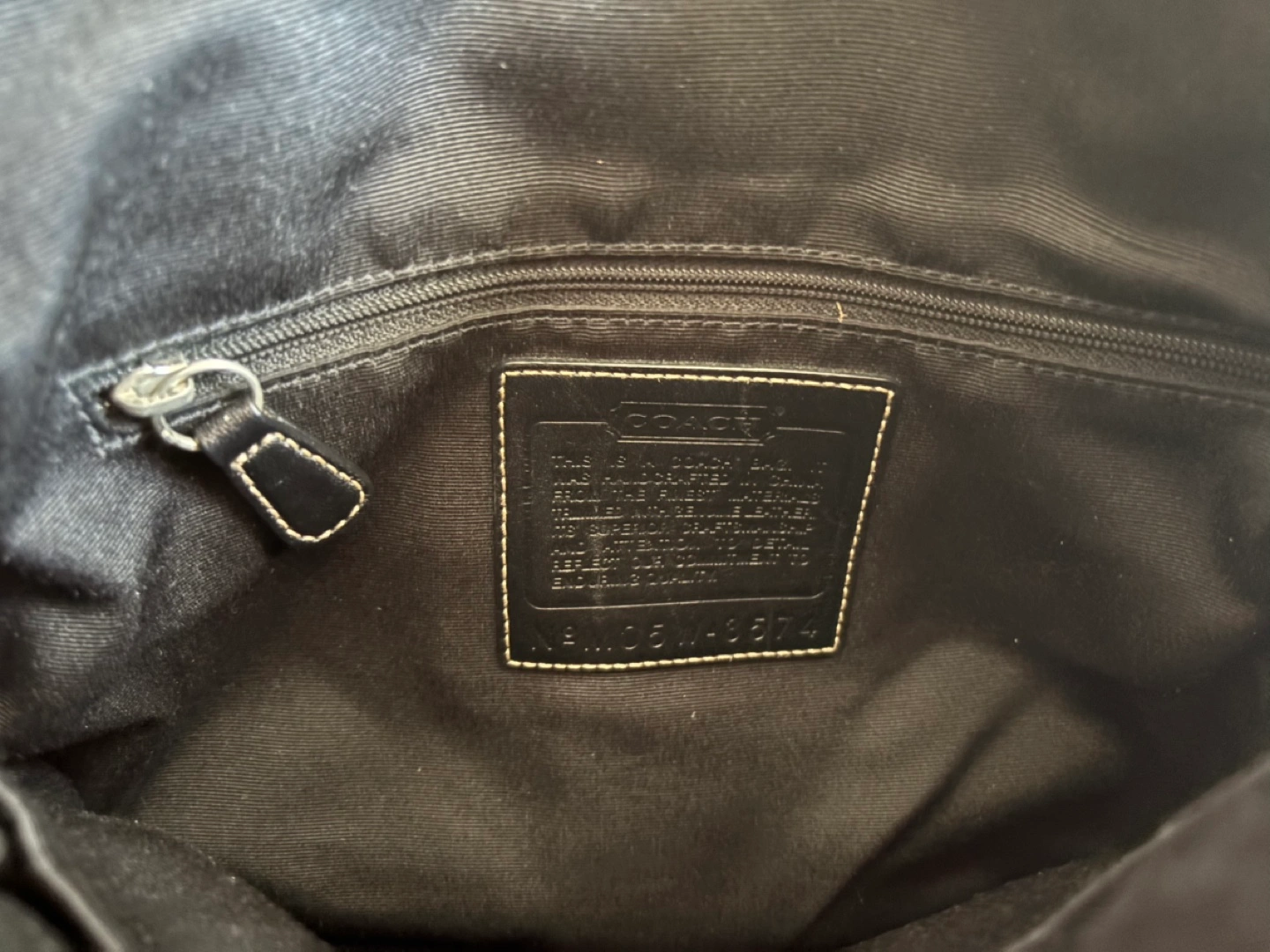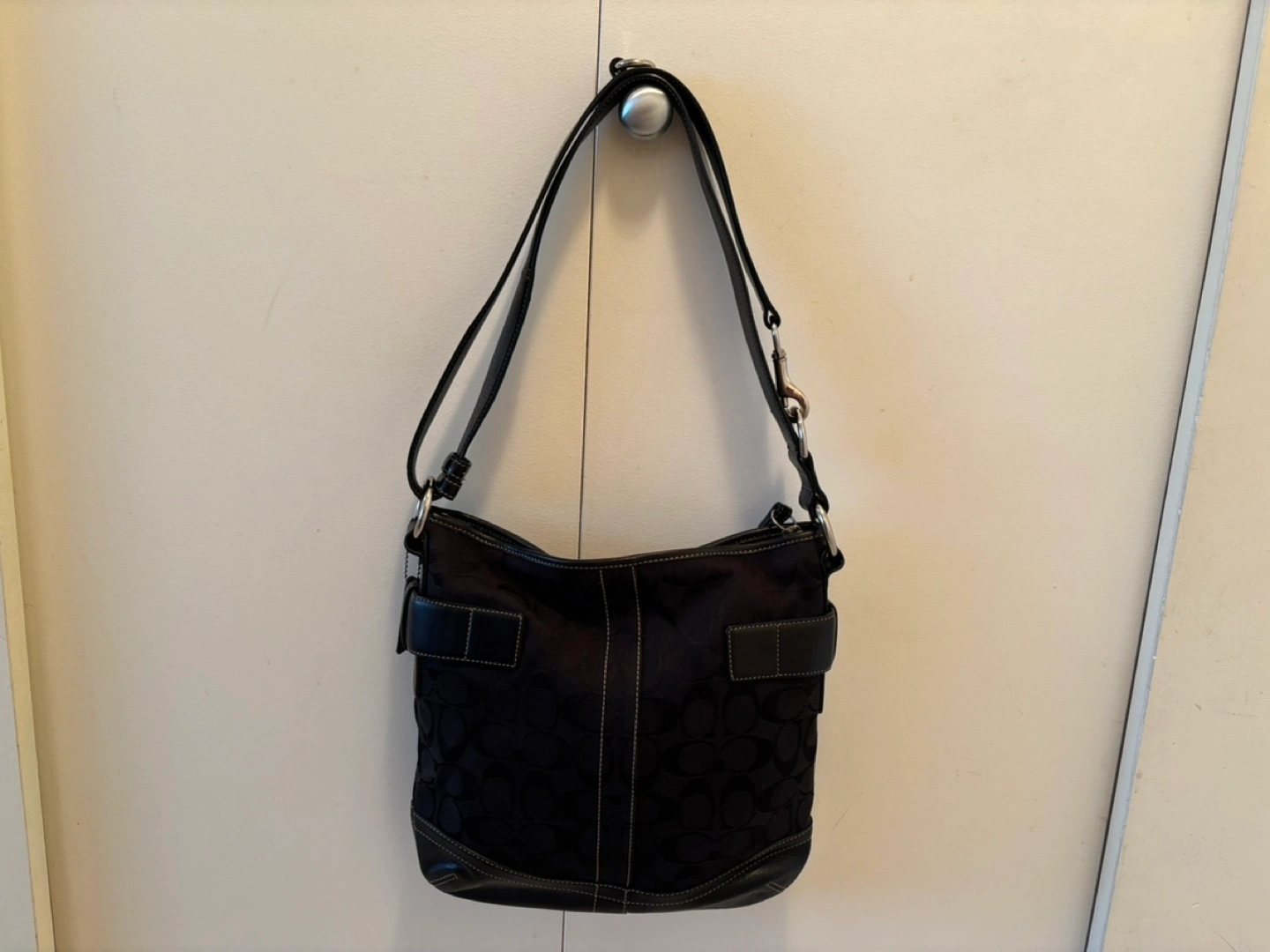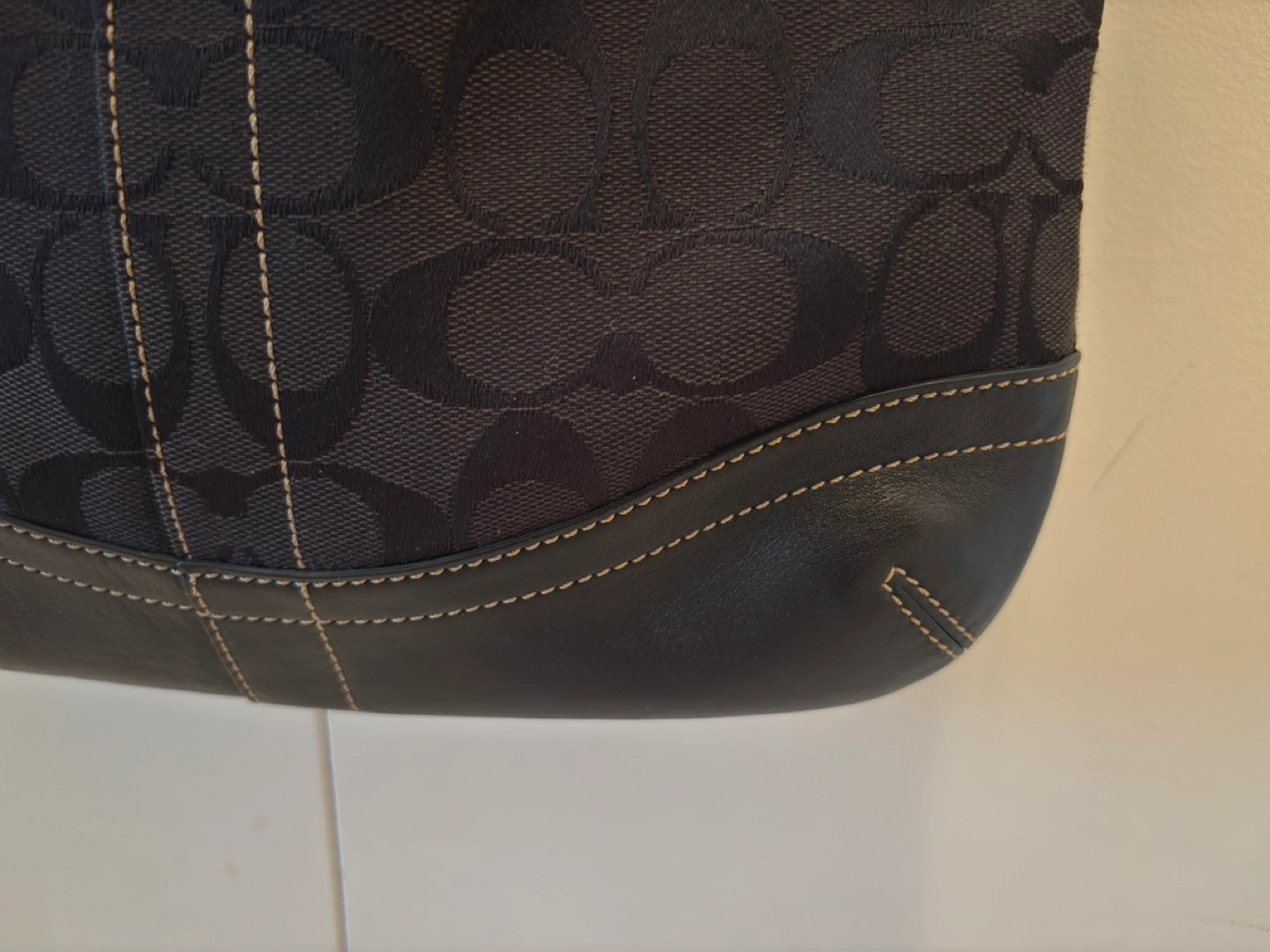 Black Coach shoulder bag. Features signature C canvas, leather trim, and silver-toned hardware. Three different lengths adjustable strap. Buckle detailing. Pre- owned. Excellent condition.