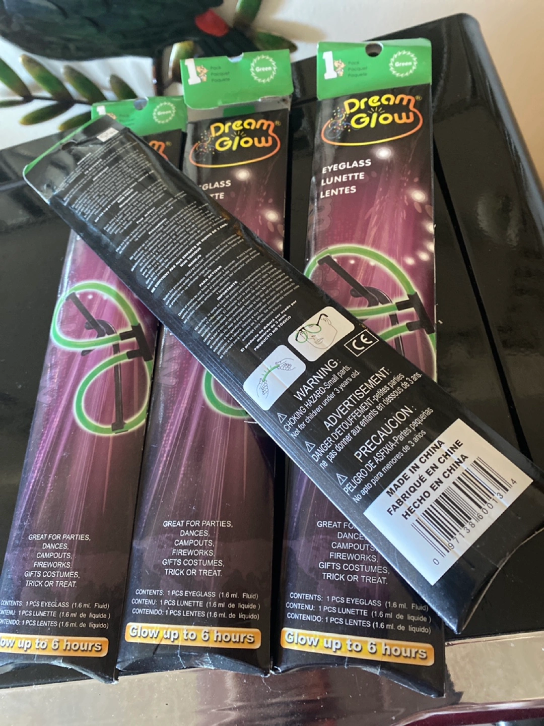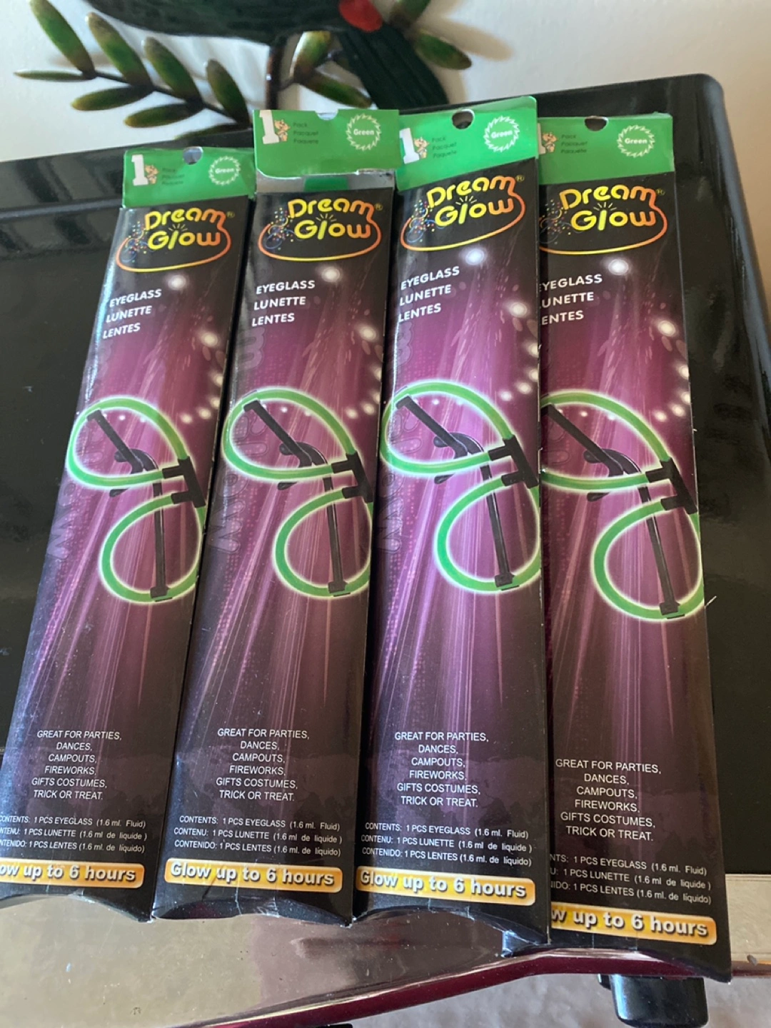 Four packages of Dream Glow eyeglass lentes. Great for parties, campouts, dances, fireworks, gifts, costumes, and trick-or-treat. Glow sticks last up to 6 hours. Made in China.