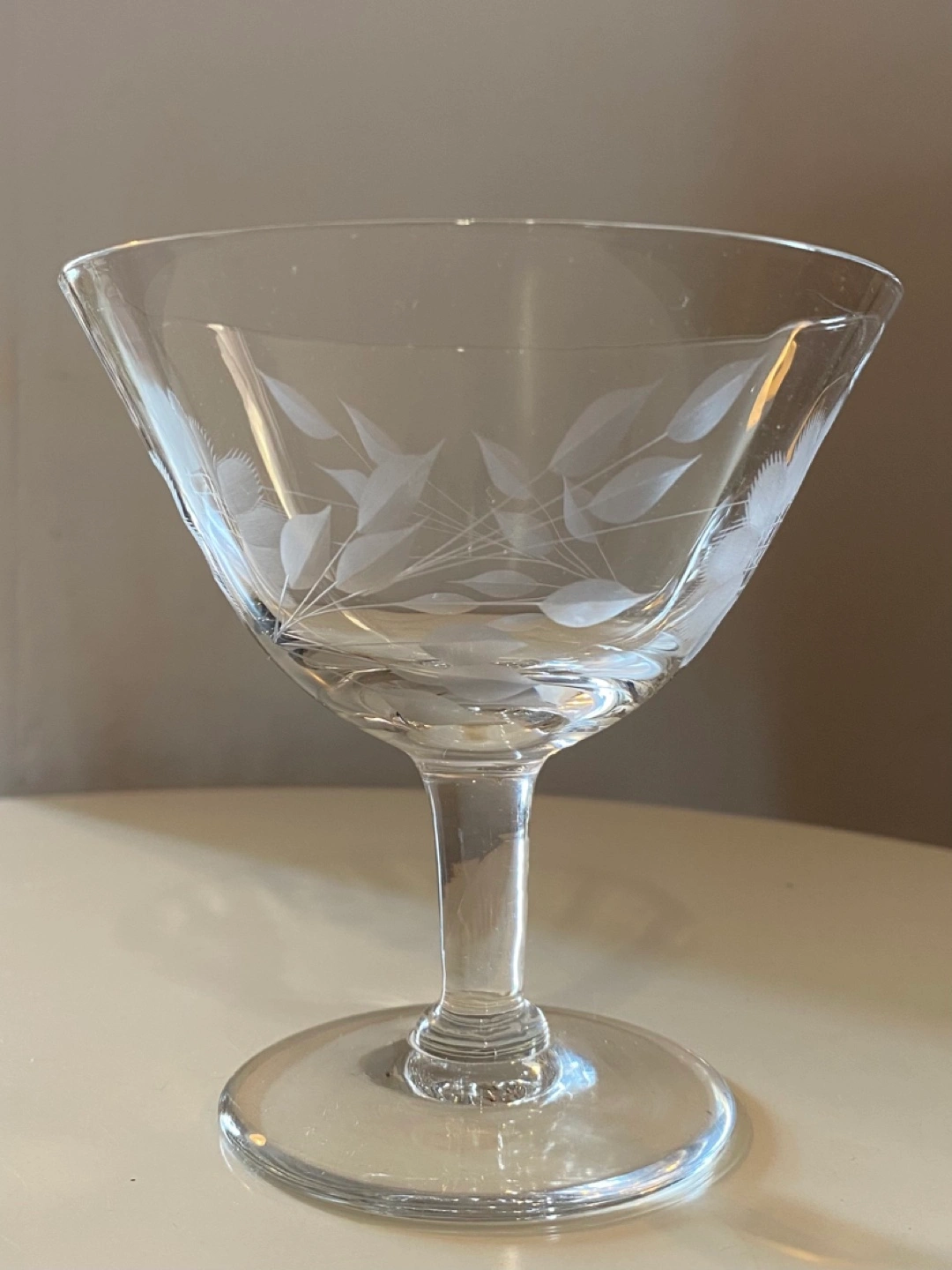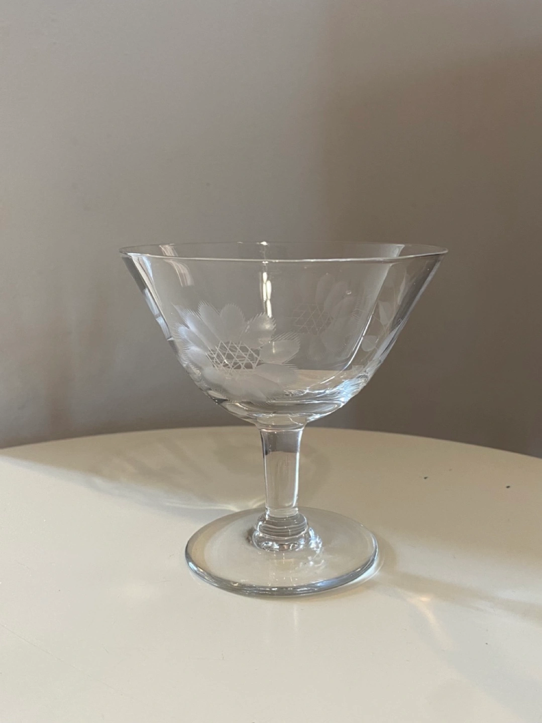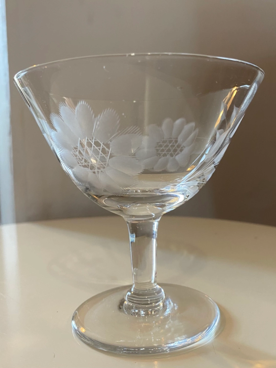 Vintage crystal sorbet/dessert/cocktail glasses. Set of five. Optic etched design of corn flower and vines with subtle multifaceted sides and flared rim.