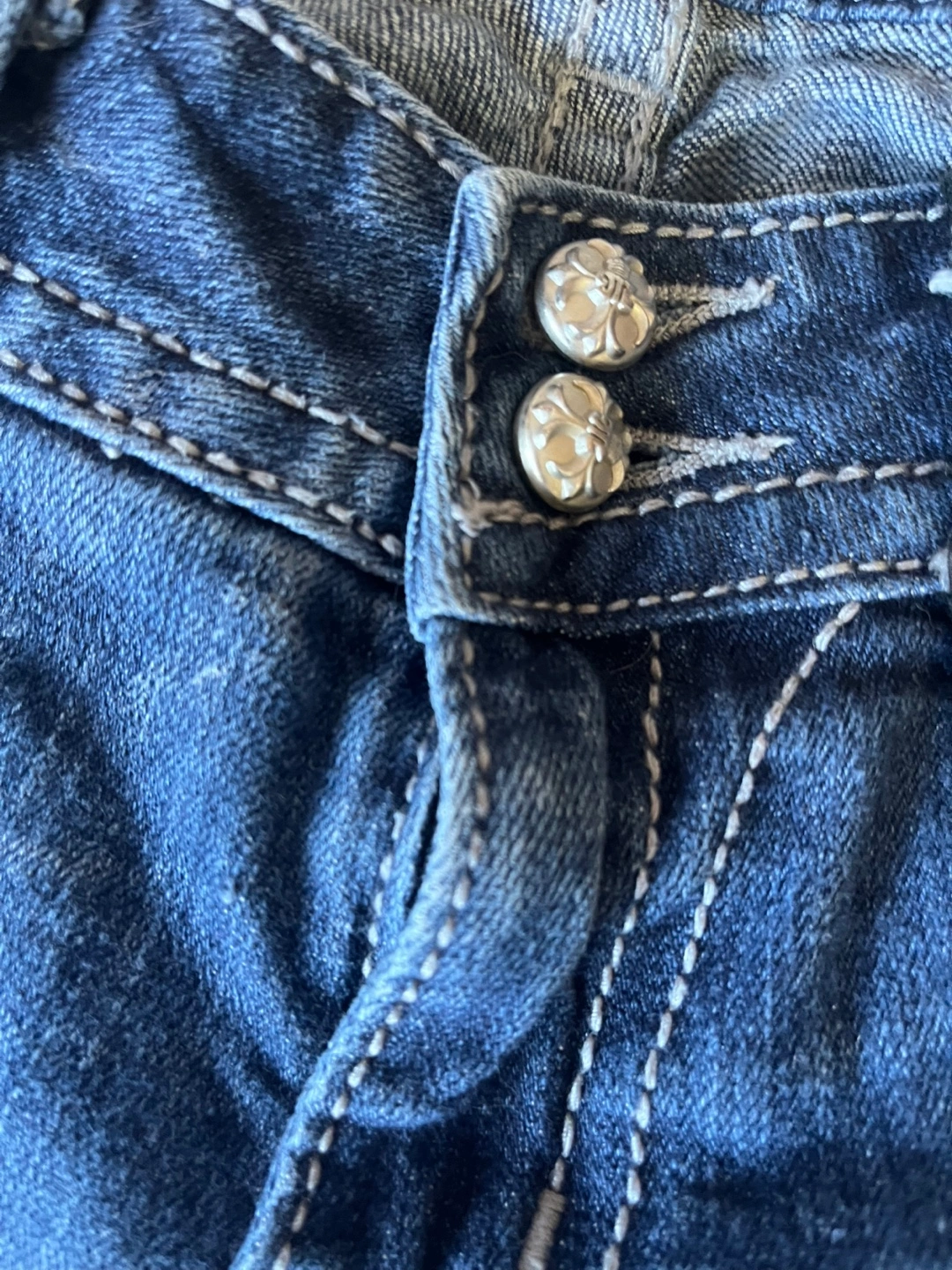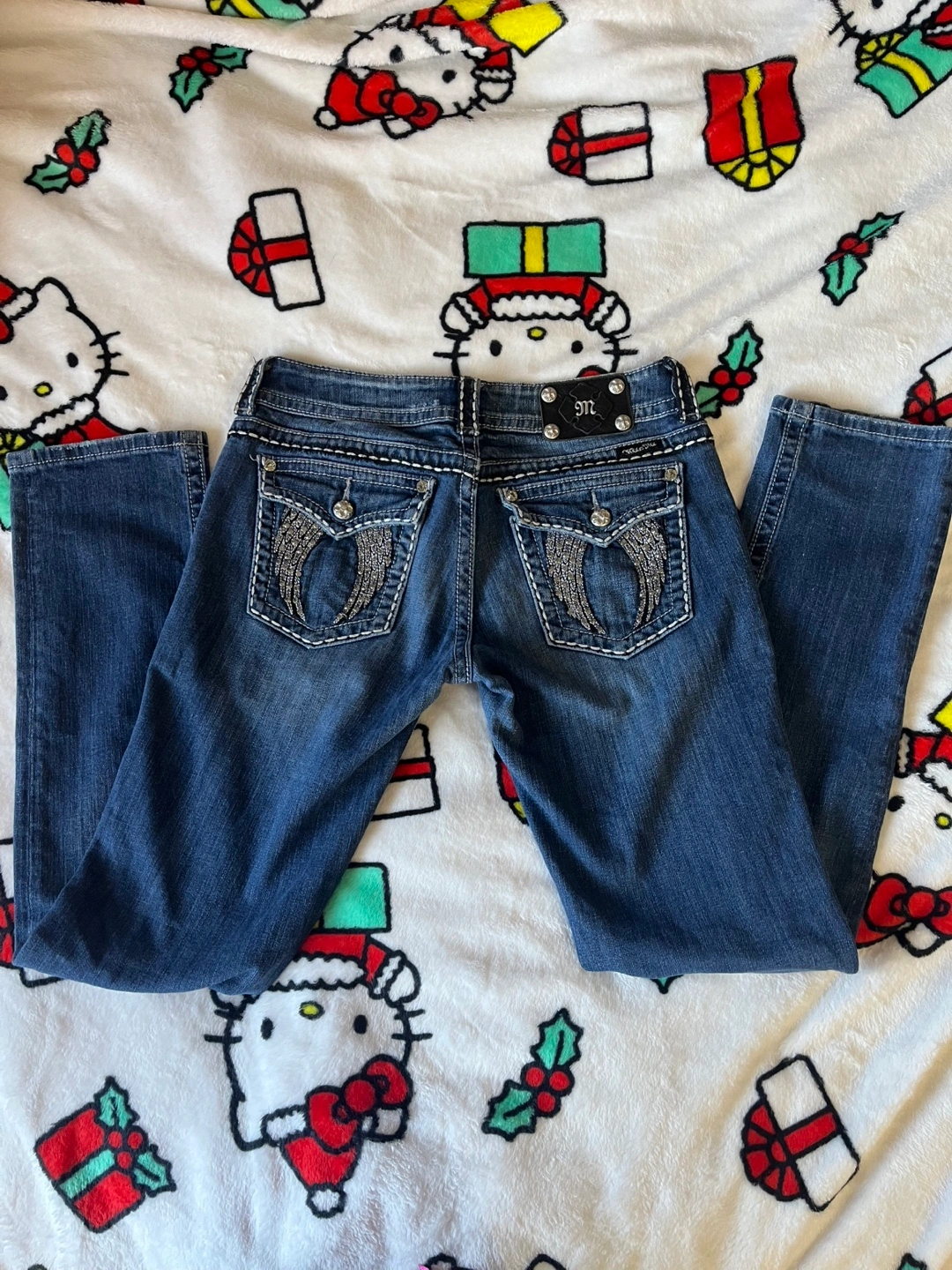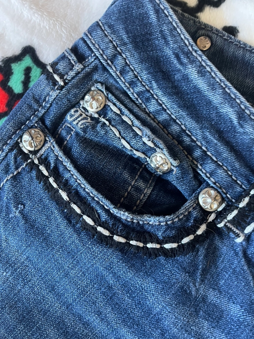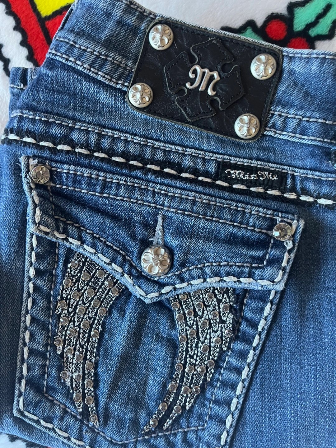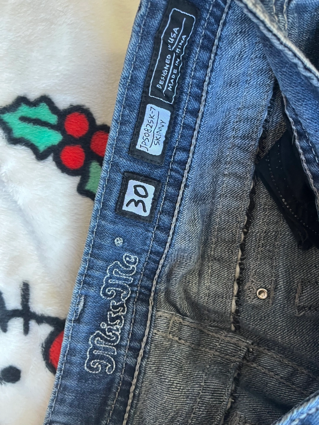 Miss Me brand jeans. Size 30. Skinny fit. Dark wash denim. Embellished pockets. Designed in the USA, made in China.