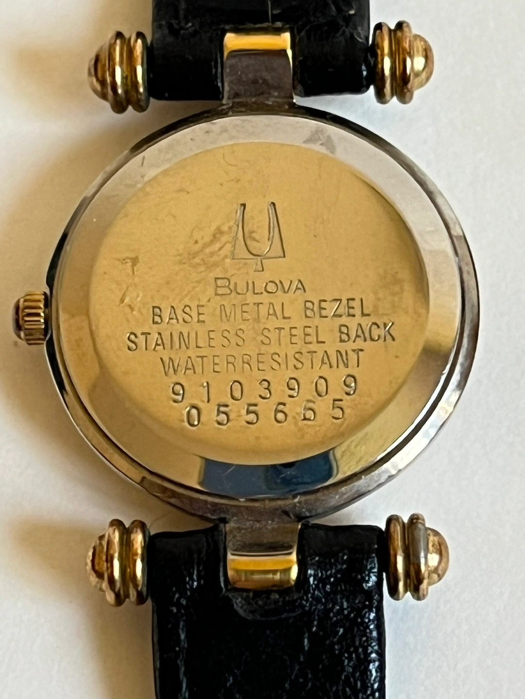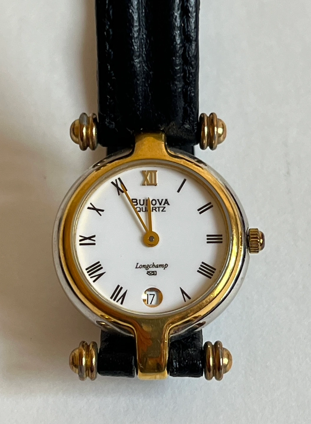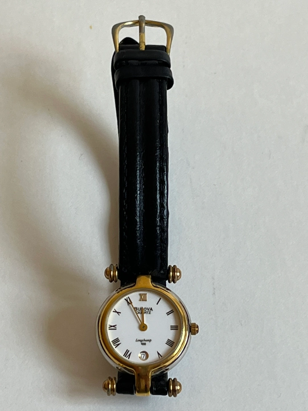 Vintage Bulova Longchamp quartz watch. Features a round white face with date function, Roman numerals, and black genuine leather band. Gold-toned accents. Water-resistant. Needs new battery.