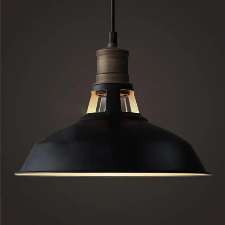 Industrial style pendant light. Black metal shade with brass accents. Perfect for kitchens, dining rooms, or other spaces.