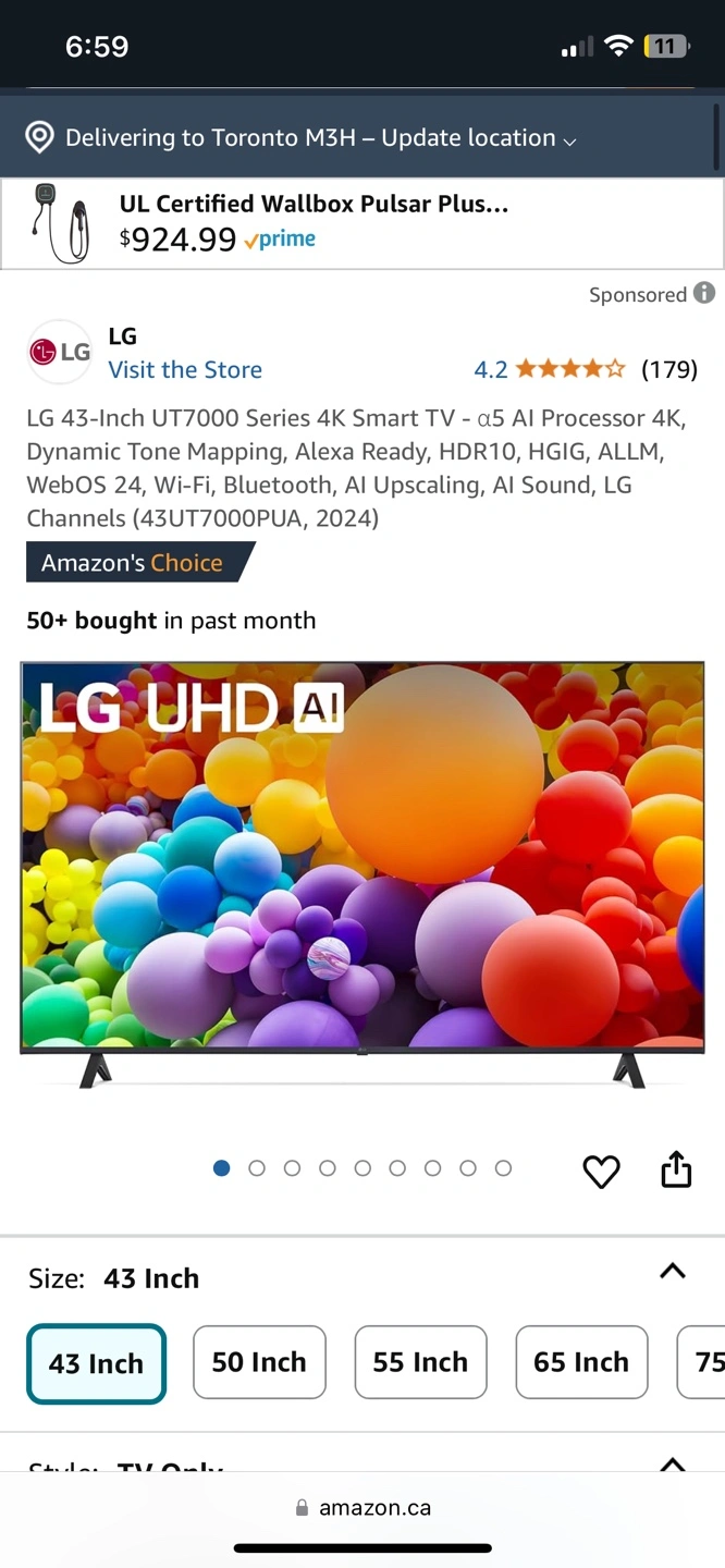 LG 43-Inch UT7000 Series 4K Smart TV - α5 AI Processor 4K, Dynamic Tone Mapping, Alexa Ready, HDR10, HGIG, ALLM, WebOS 24, Wi-Fi, Bluetooth
