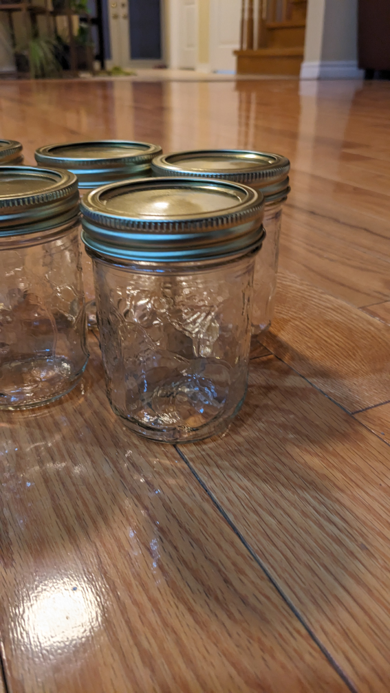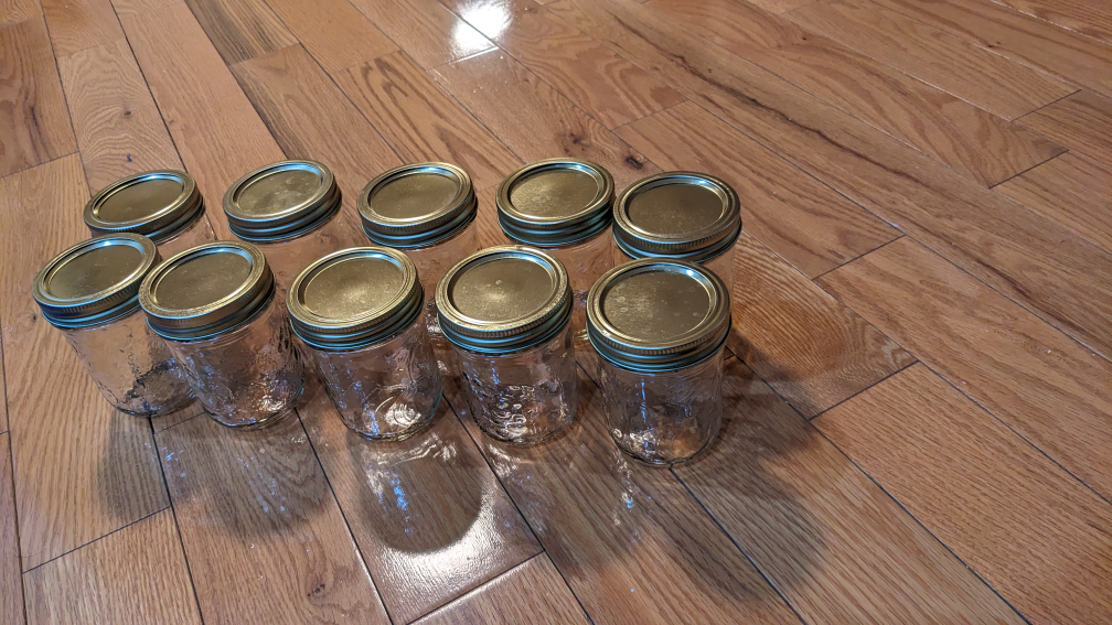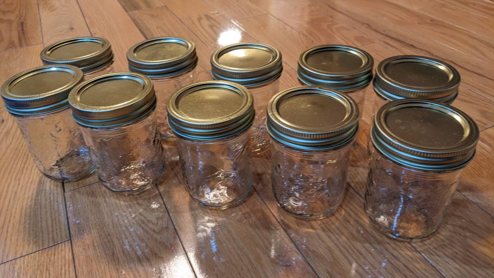 Ten empty glass mason jars. Gold coloured lids included. Perfect for canning, storing food, or crafting.