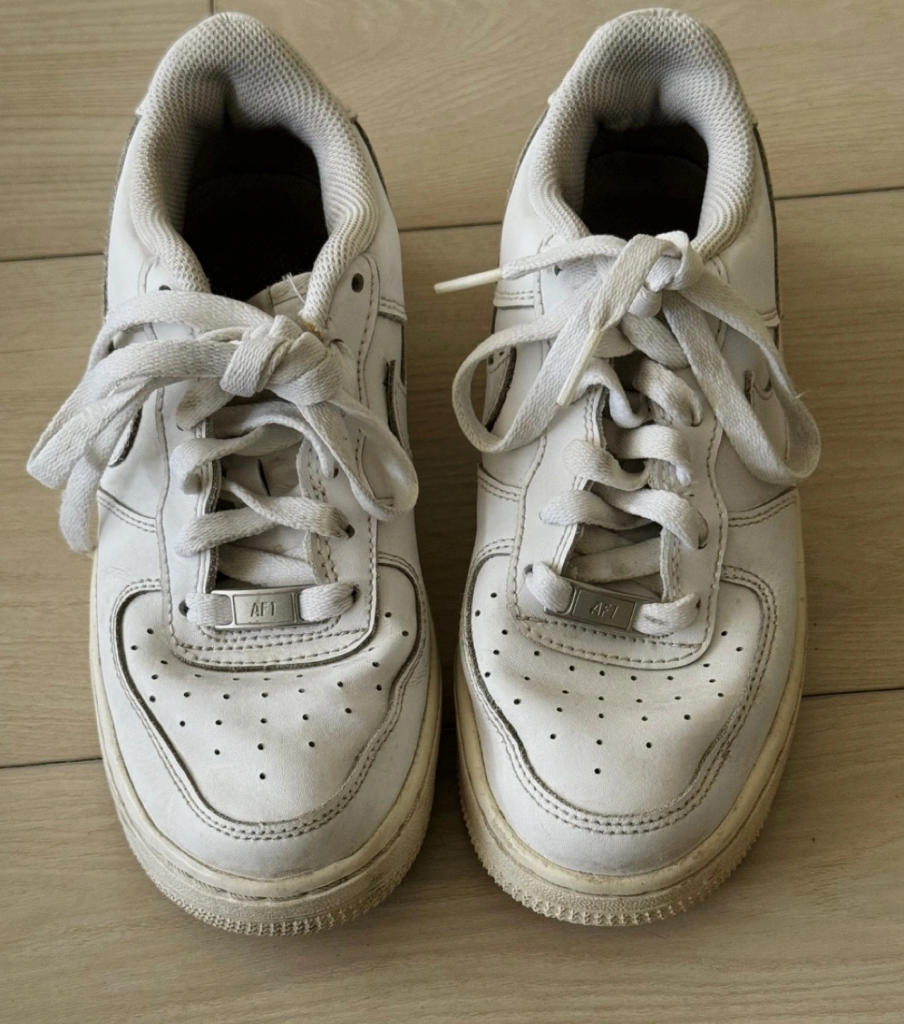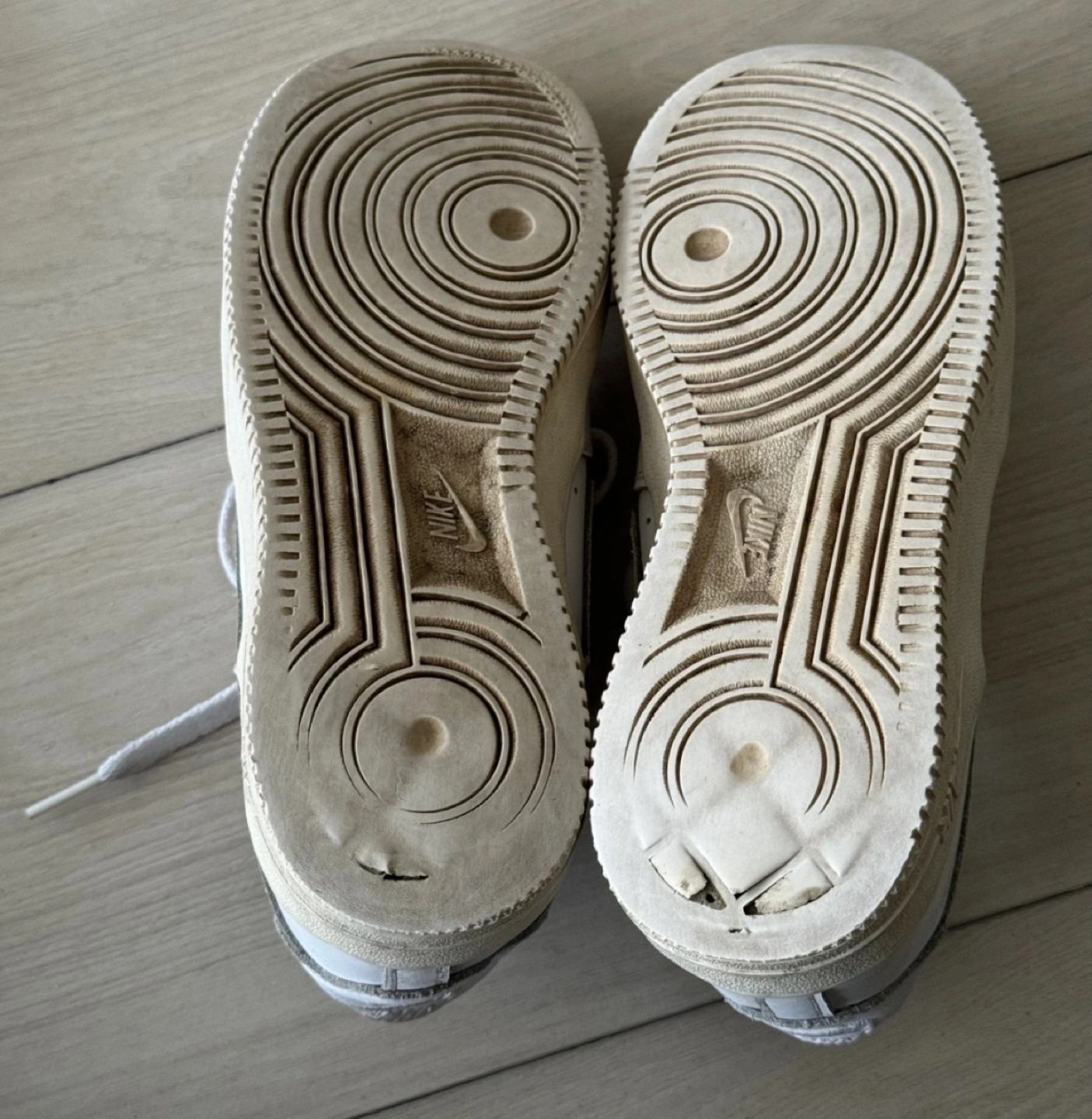 Women’s size 6 white Air Force 1s! Classic white sneakers, as pictured. In good overall condition, still has lots of life left. No rips or stains, just needs a bit of a clean. Great beaters for a night out, work, etc. No try-ons (for obvious hygiene purposes) so please make sure they will fit your shoe size before arranging a pickup.