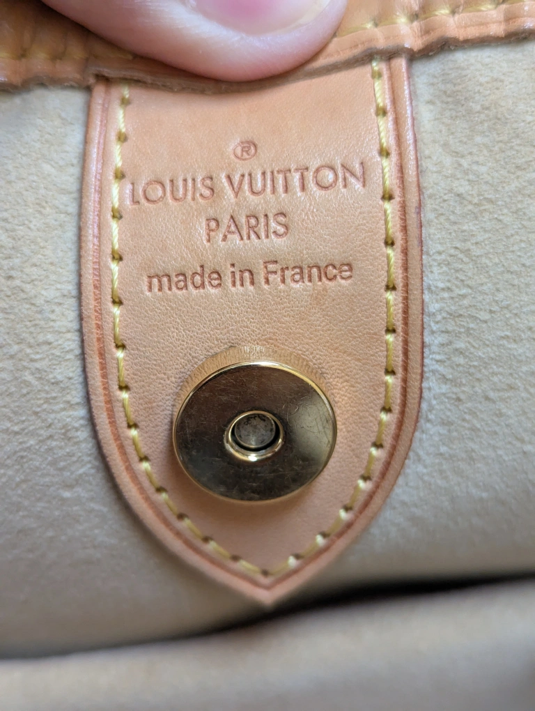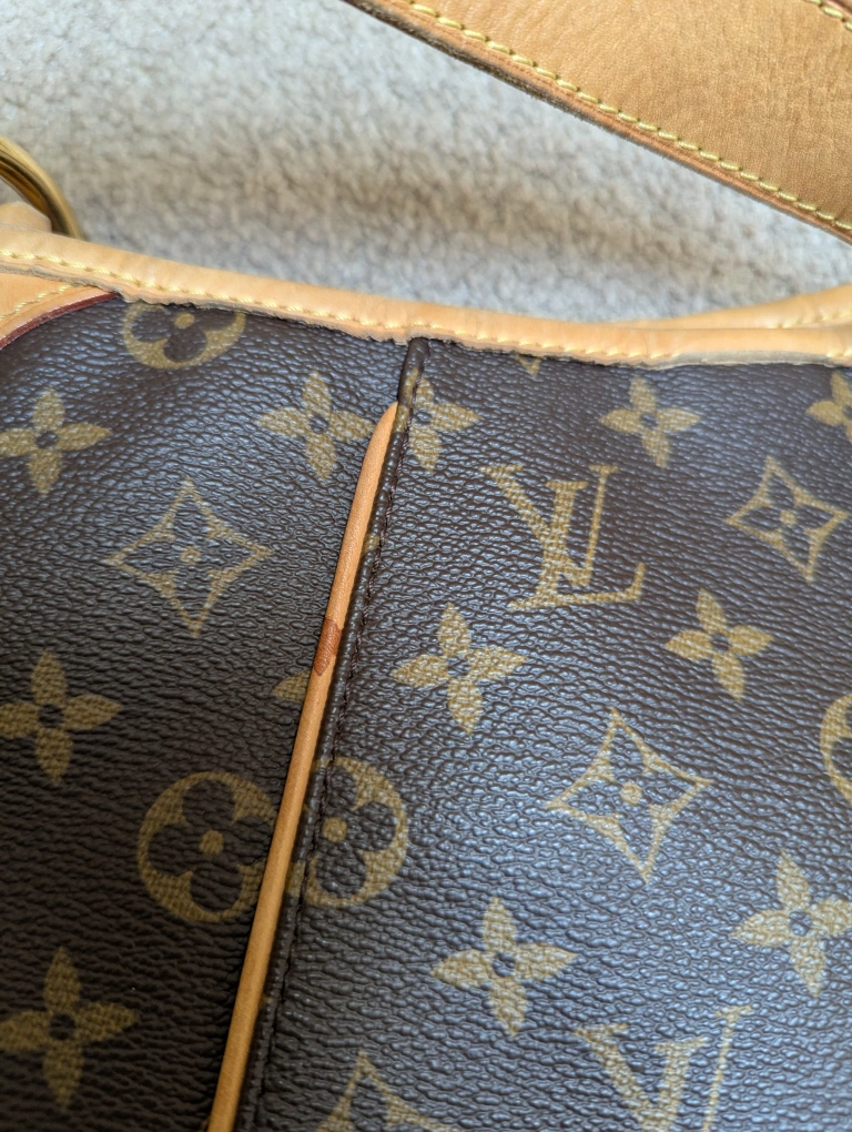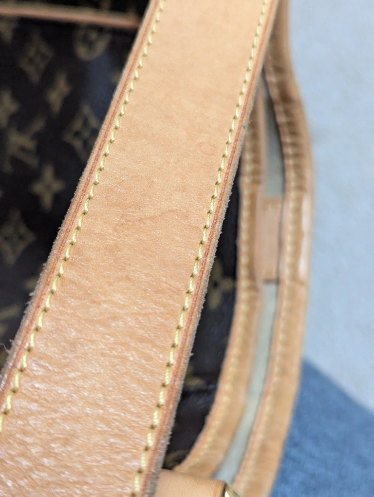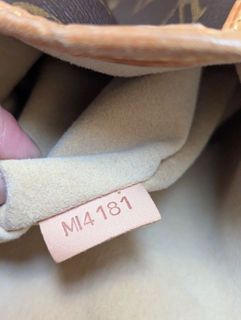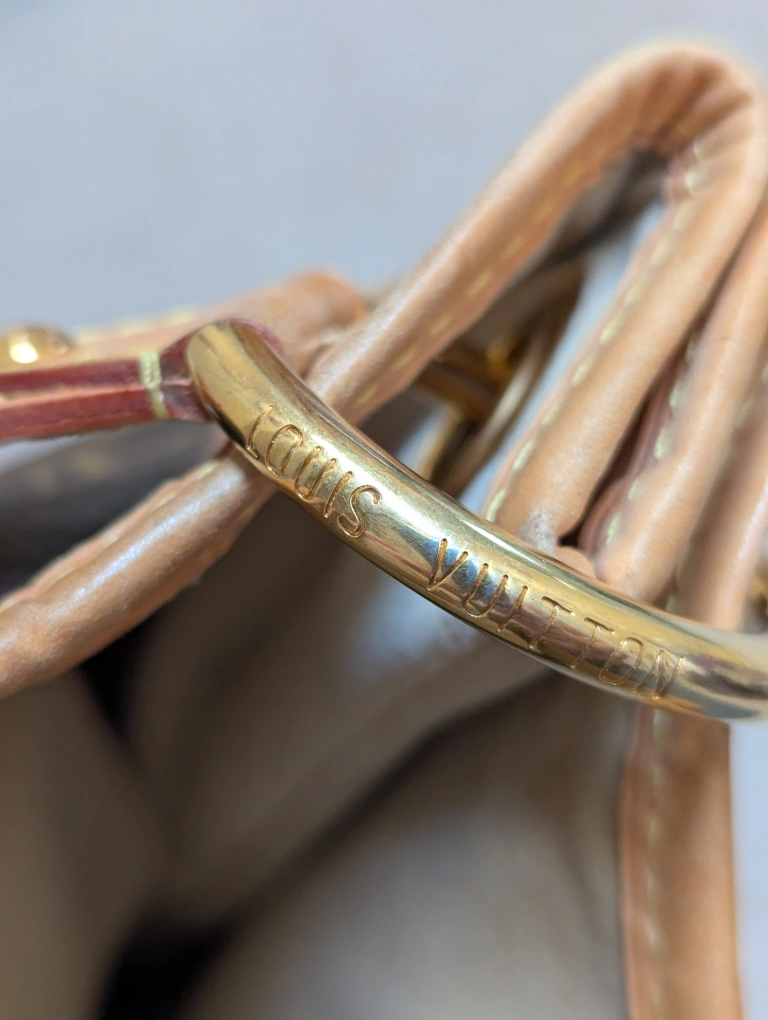 Pre-loved Louis Vuitton handbag. Monogram canvas. Brown and tan leather trim. Gold-tone hardware. Shoulder strap. Some wear and tear present but still in excellent condition. Recently authenticated.