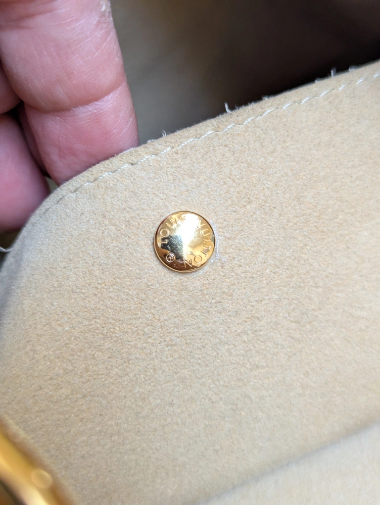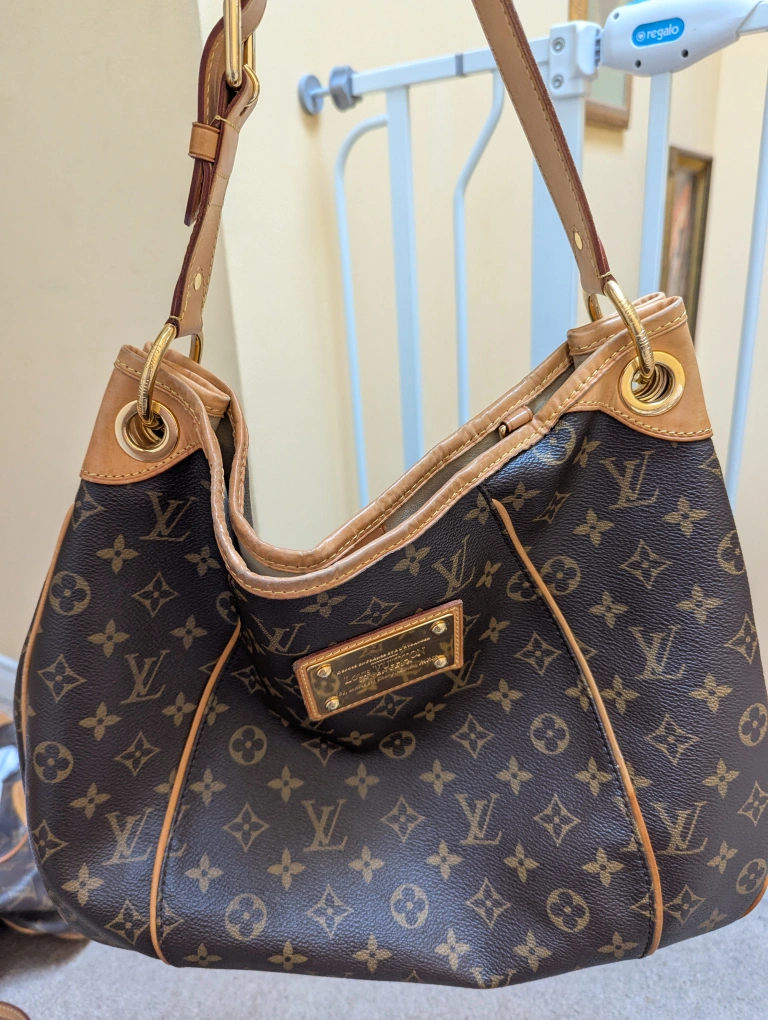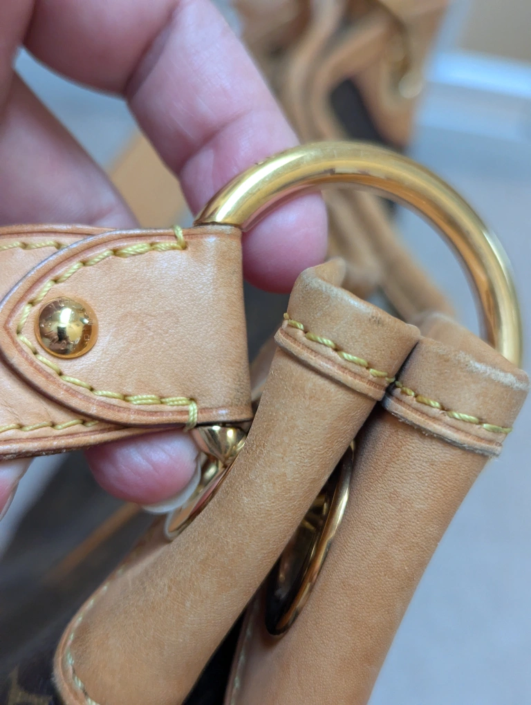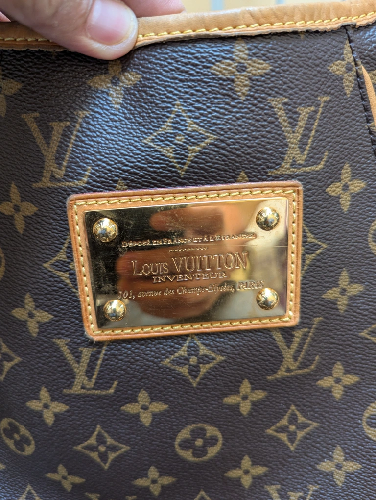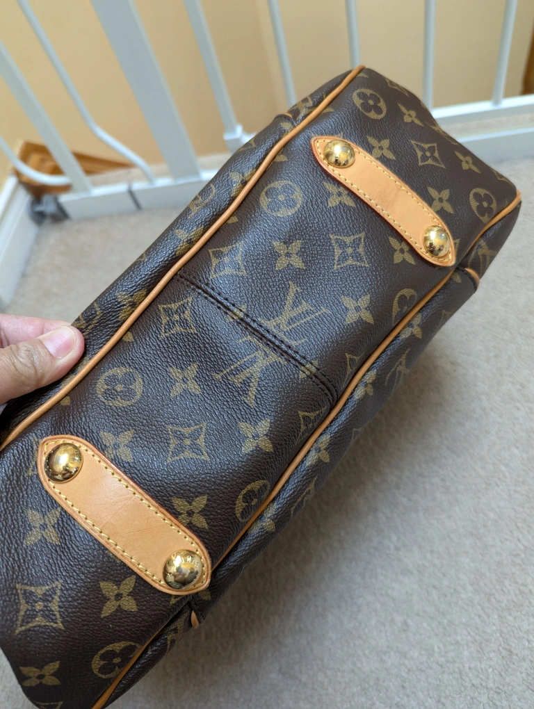 Pre-loved Louis Vuitton handbag. Monogram canvas. Brown and tan leather trim. Gold-tone hardware. Shoulder strap. Some wear and tear present but still in excellent condition. Recently authenticated.