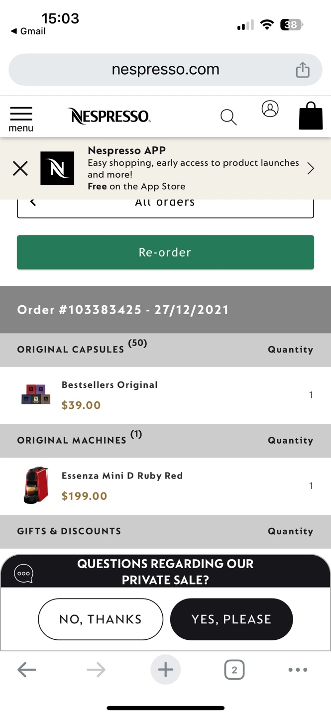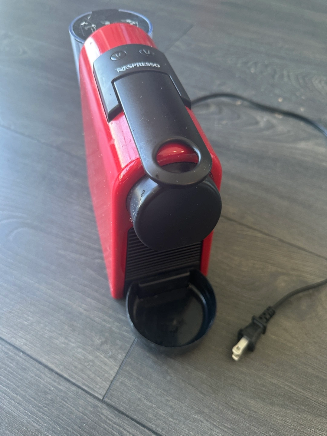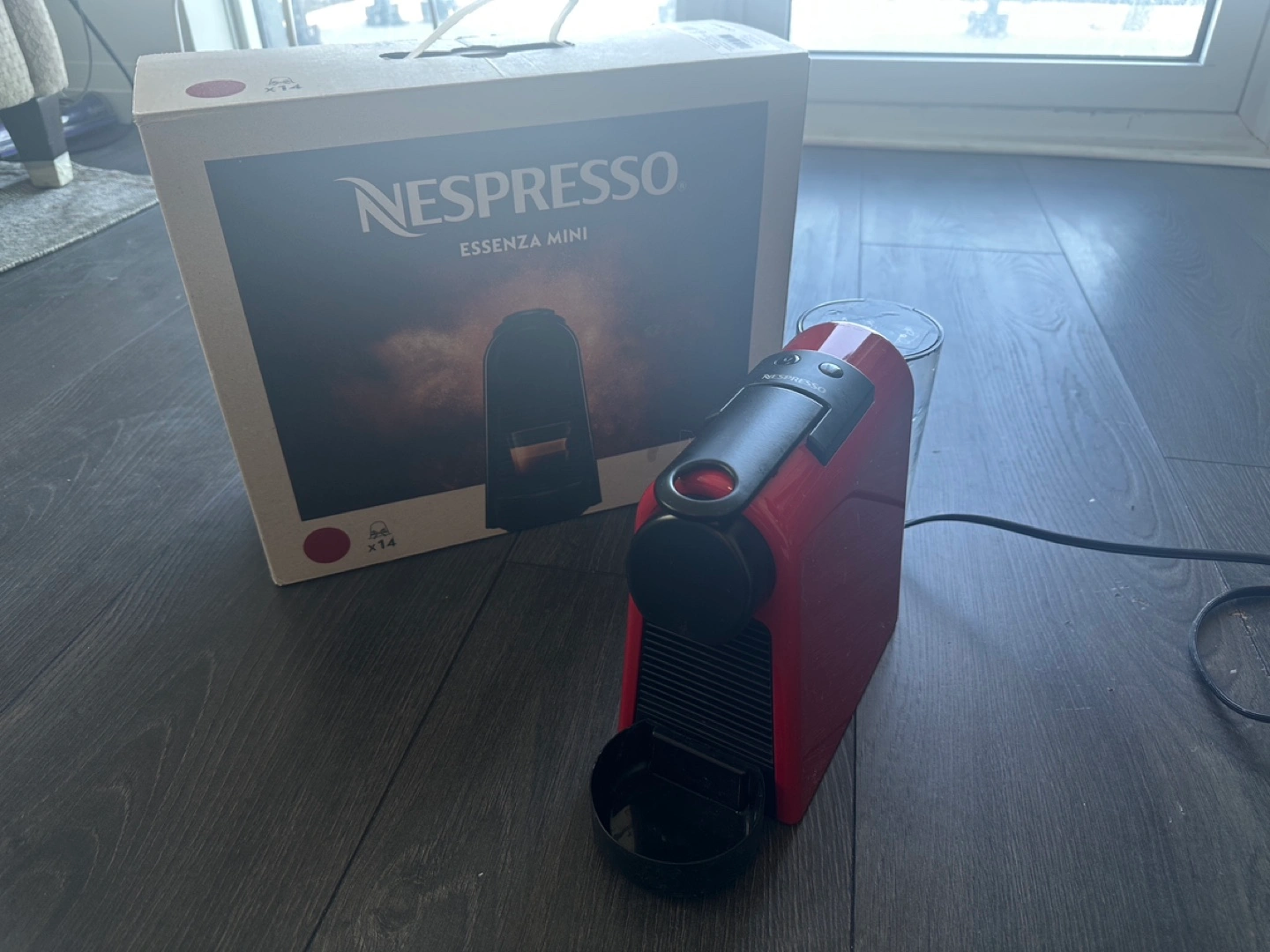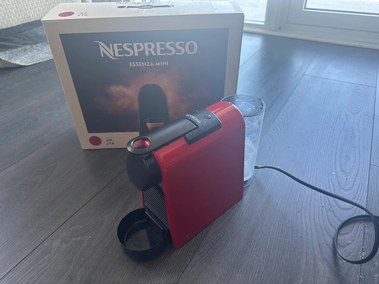 Pre-owned Nespresso Essenza Mini coffee machine. Ruby red colour. Includes original box. Compact design. Makes espresso and lungo.