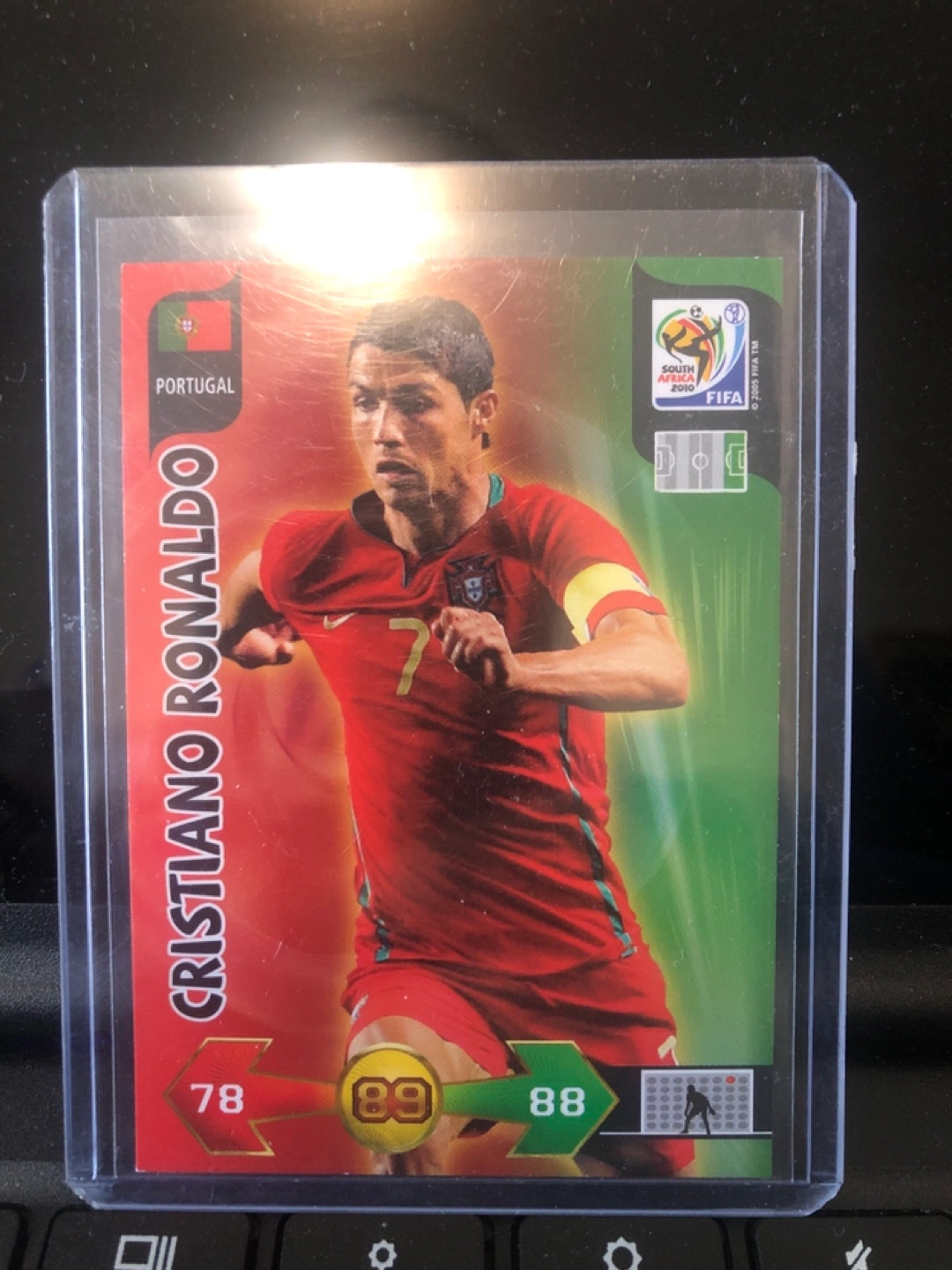 Cristiano Ronaldo trading card. Part of the 2010 FIFA World Cup Adrenalyn XL collection. Shows Portugal player in action. Card is in a plastic protector.