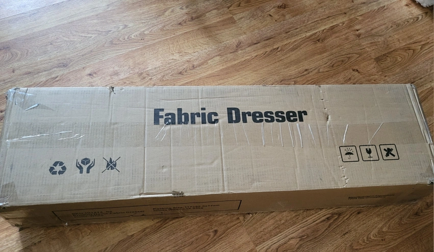 Brand new, still in box. Fabric dresser with multiple drawers. Easy assembly. Includes instruction manual.
