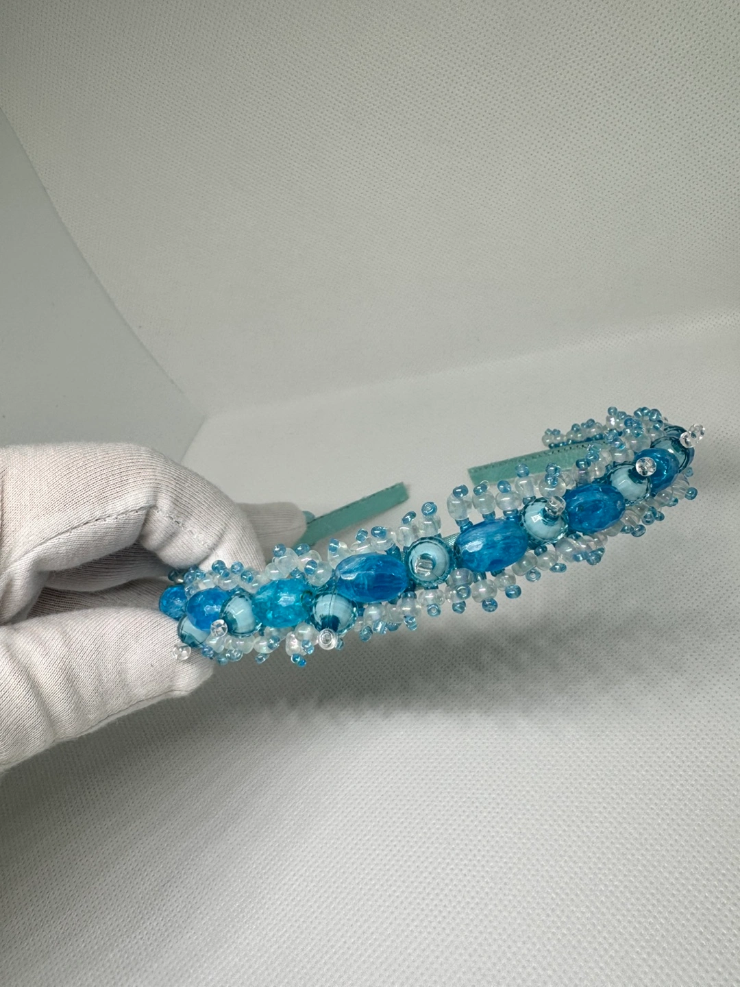 Beautiful light blue and white beaded headband. Features various sized beads, some opaque and some transparent. Elegant design, perfect for special occasions.