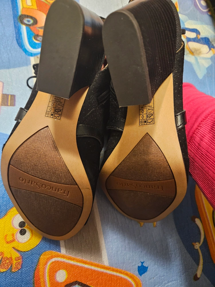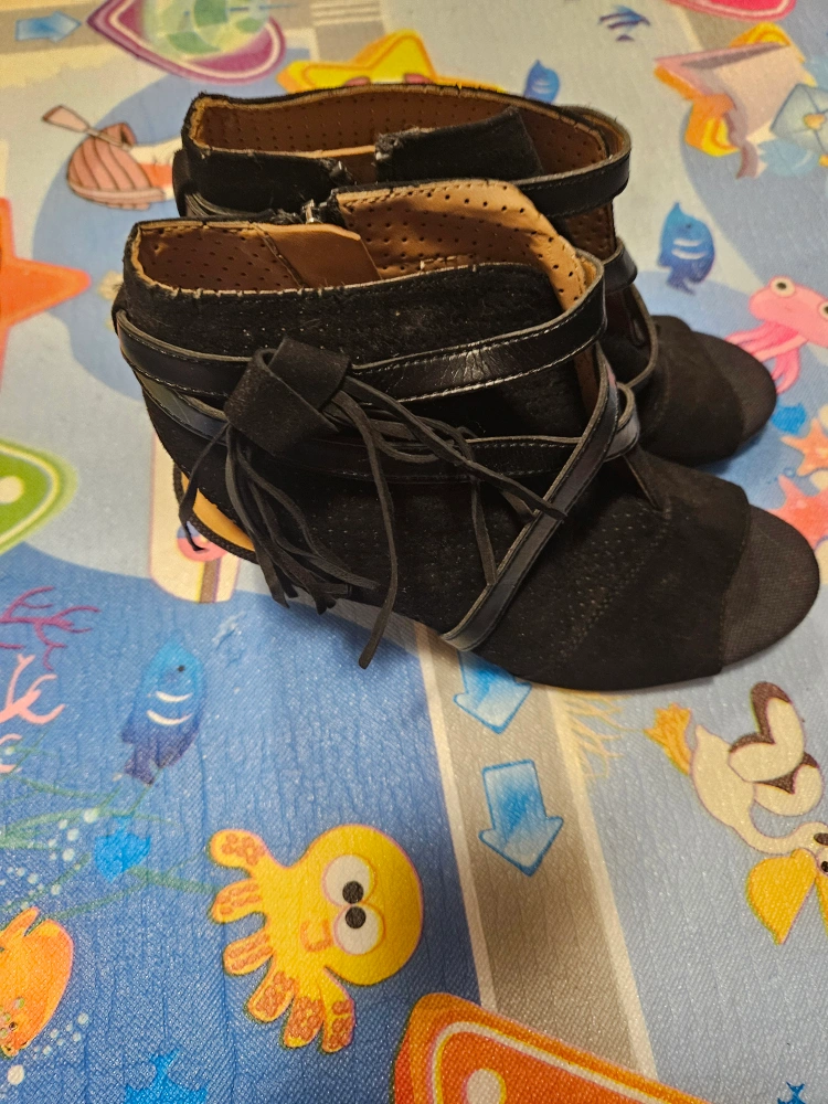 Women's black suede open-toe booties. Features fringe detailing and criss-cross straps. Block heel. Size 7.5.