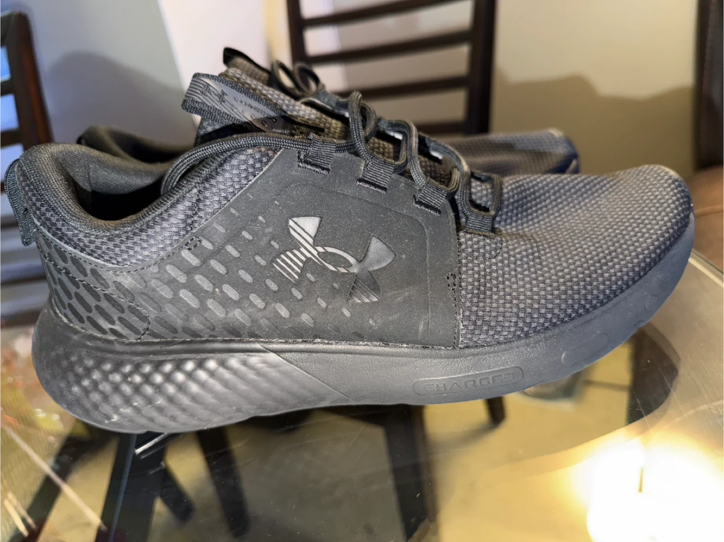 Men's black Under Armour Charged Assert 10 running shoes. Features a breathable mesh upper and durable rubber outsole. Includes a comfort deluxe system insole. Great for athletic activities!