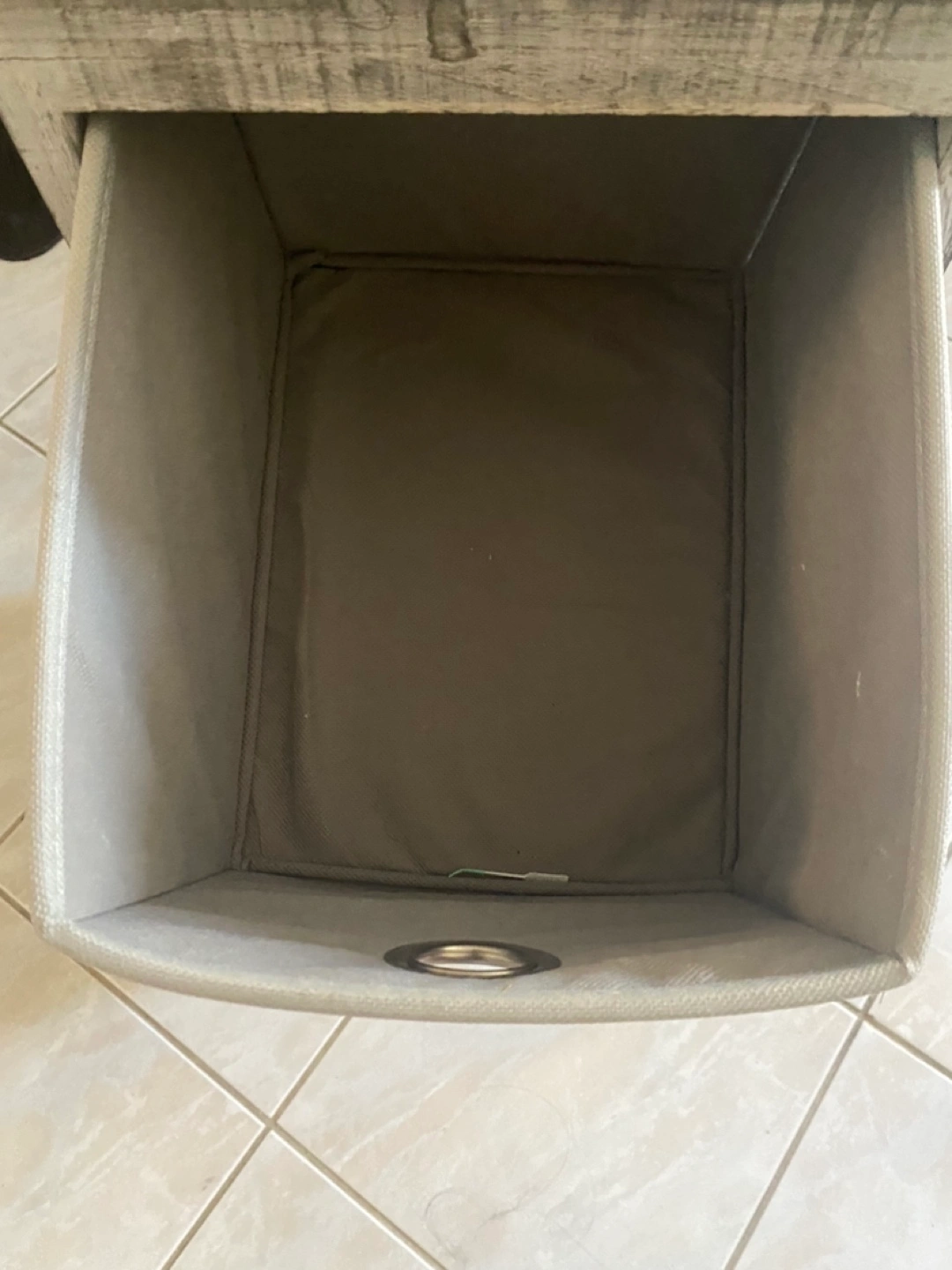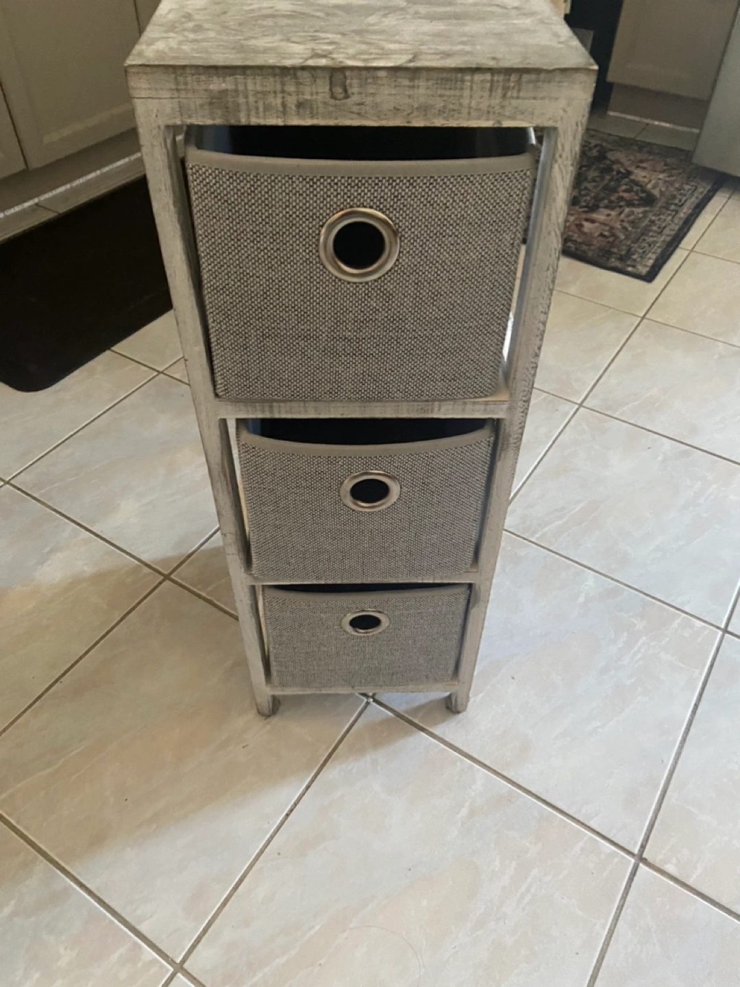 Grey fabric drawers. Whitewashed wooden frame. Perfect for organizing small items. Good condition.