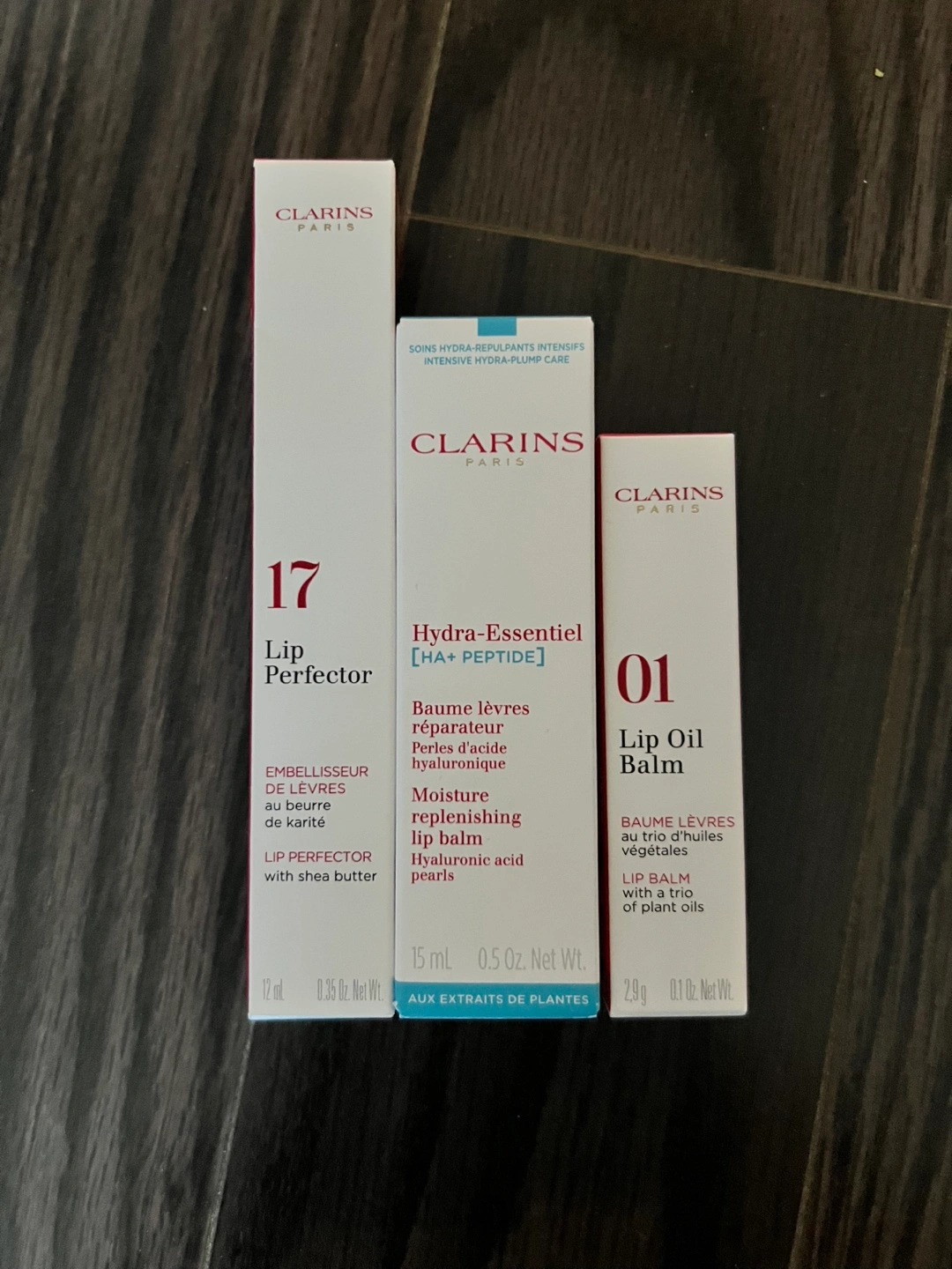 Set of three Clarins lip products: Lip Perfector with shea butter (sold) Hydra-Essentiel lip balm with hyaluronic acid pearls, and Lip Oil Balm with plant oils. New and unused.