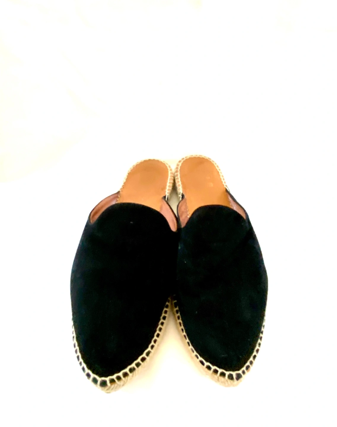 Pair of black suede espadrille mules. Pointed-toe design. Natural jute rope trim. Lightly worn.