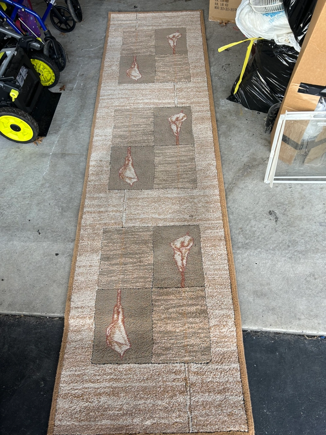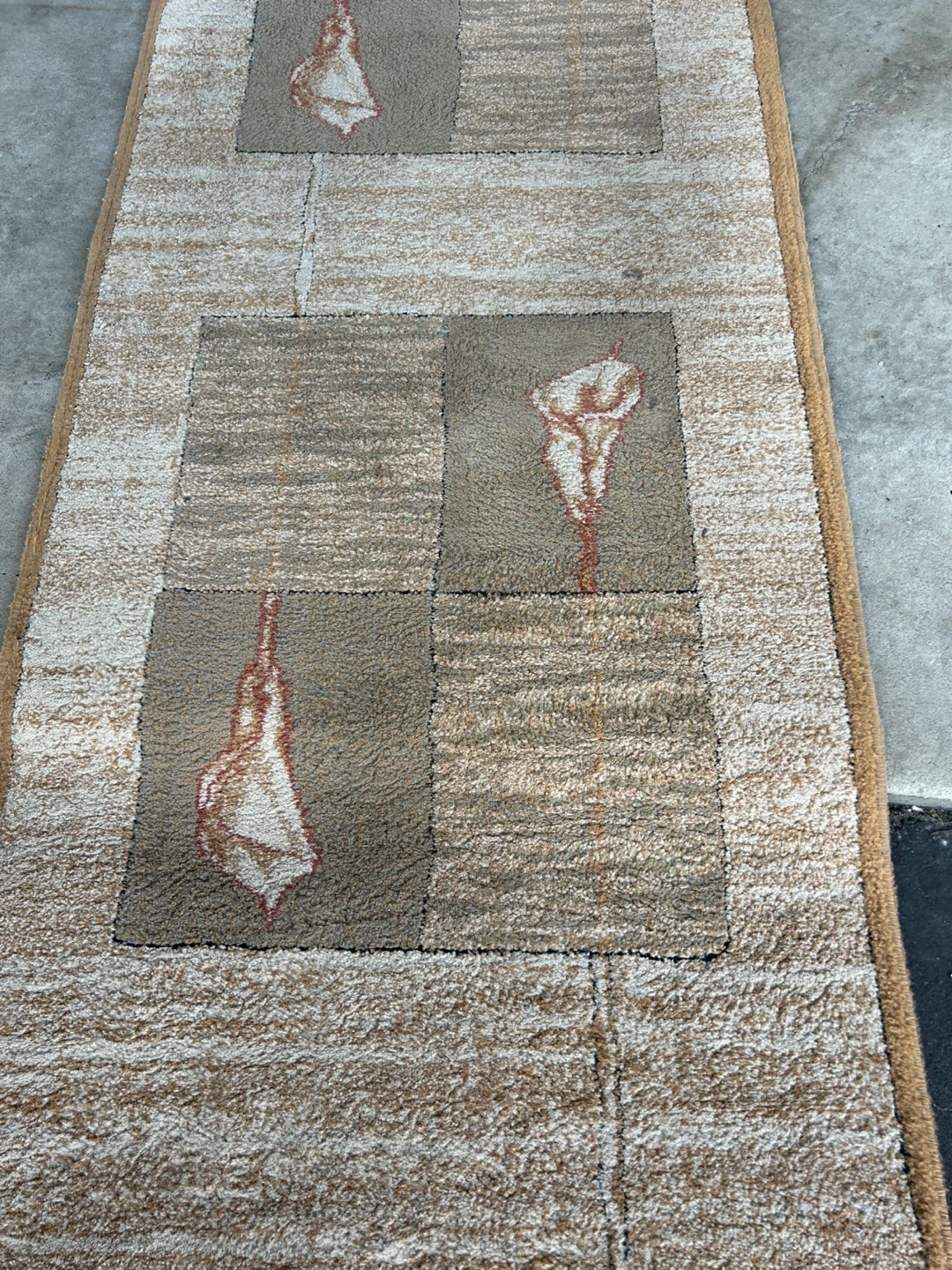 Neutral coloured hallway runner. Features a repeating pattern of stylized flowers. Excellent for adding a touch of elegance to your home. Good condition.