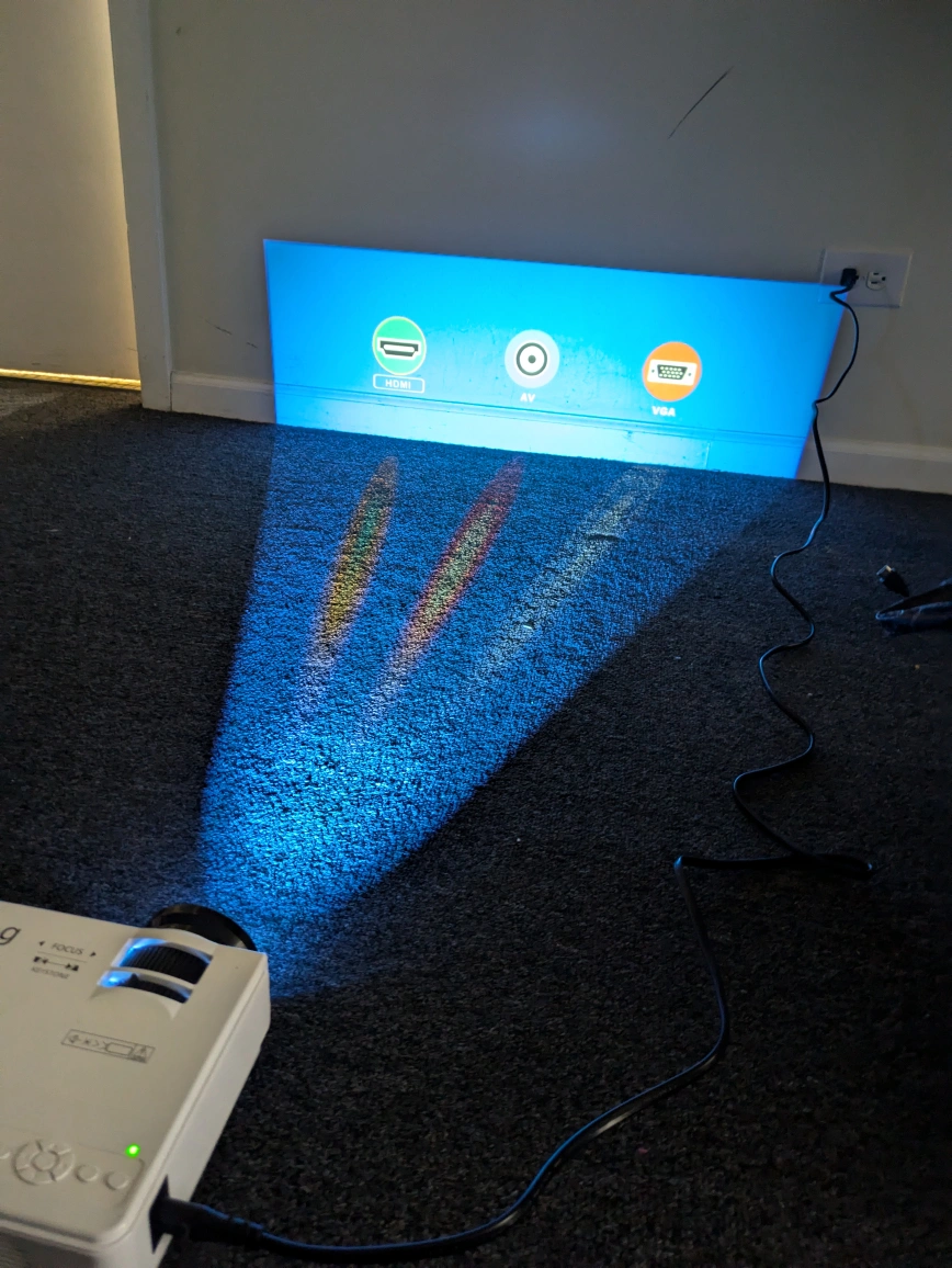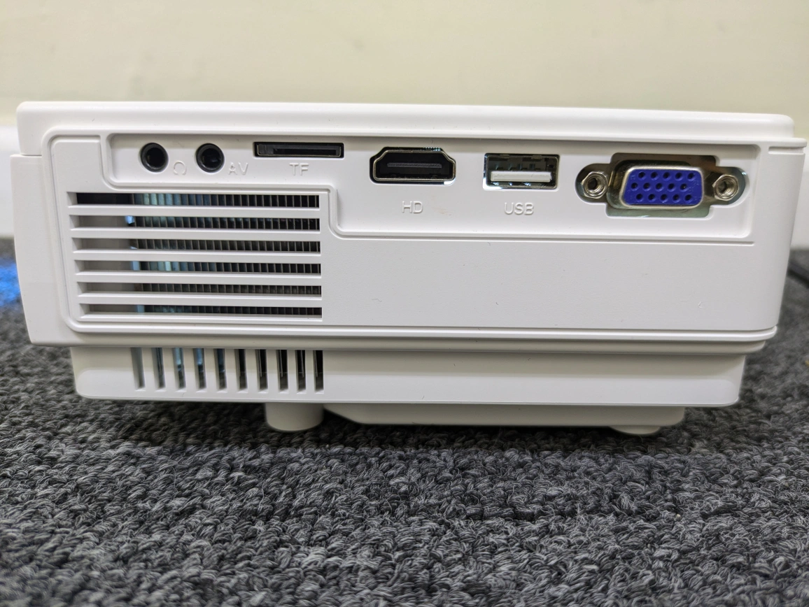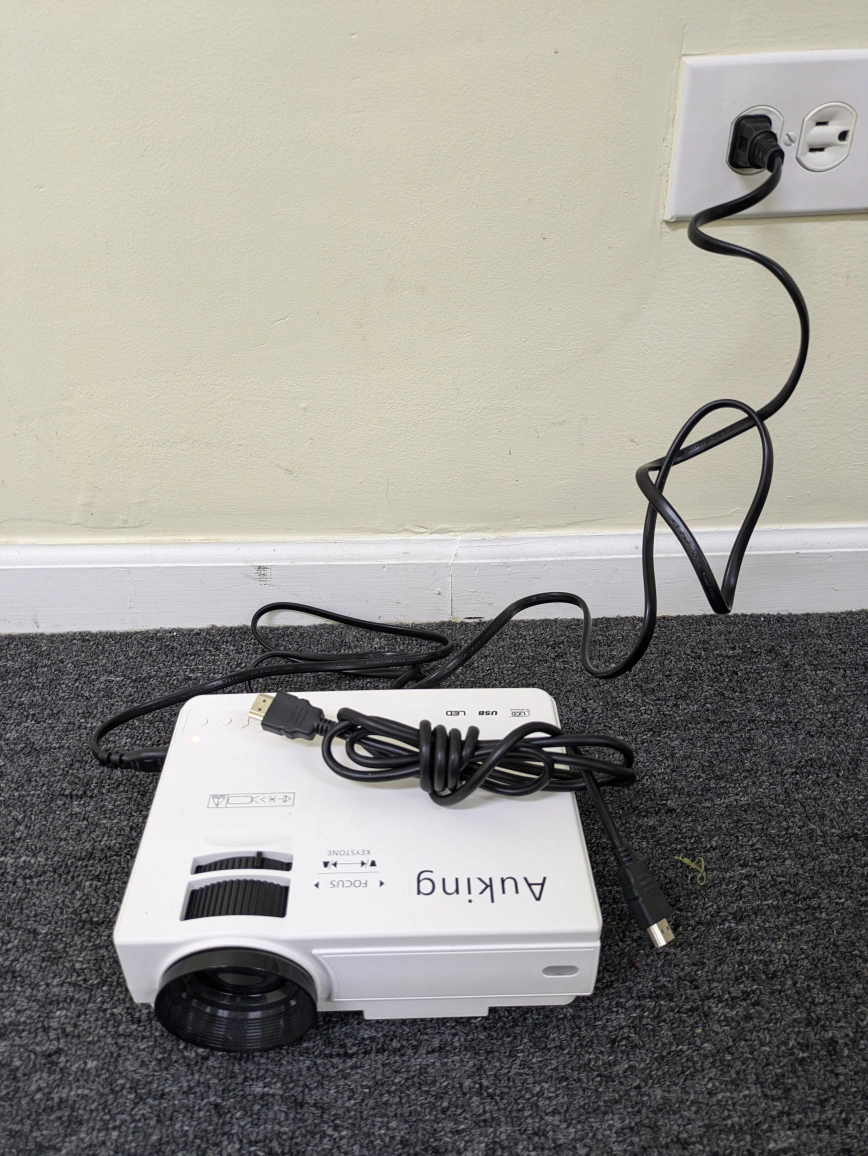Compact LED projector. Multiple ports: HDMI, USB, VGA, AV. Includes power cord. Focus and keystone adjustment. Great for movies, presentations, and gaming. The projector is in excellent condition. Comes with power cord and HDMI cable. No remote