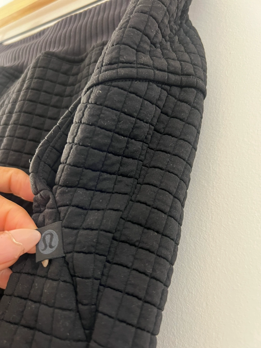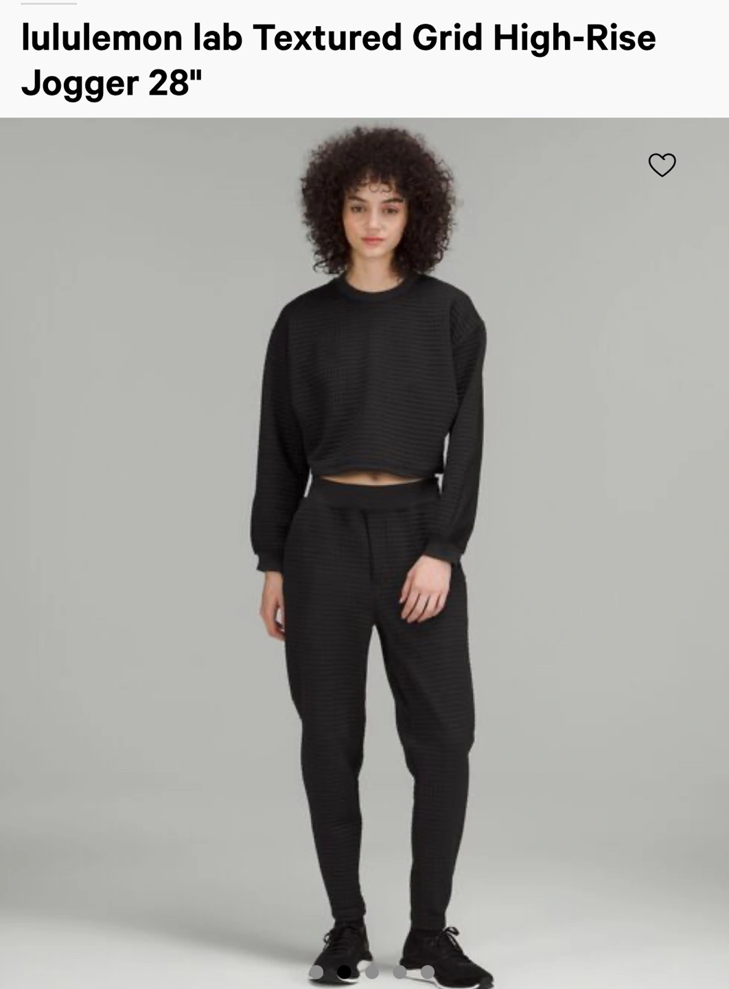 Black Lululemon Lab joggers. High-rise waist. Textured grid pattern. 28" inseam. Side pockets. Elastic waistband with drawstring.