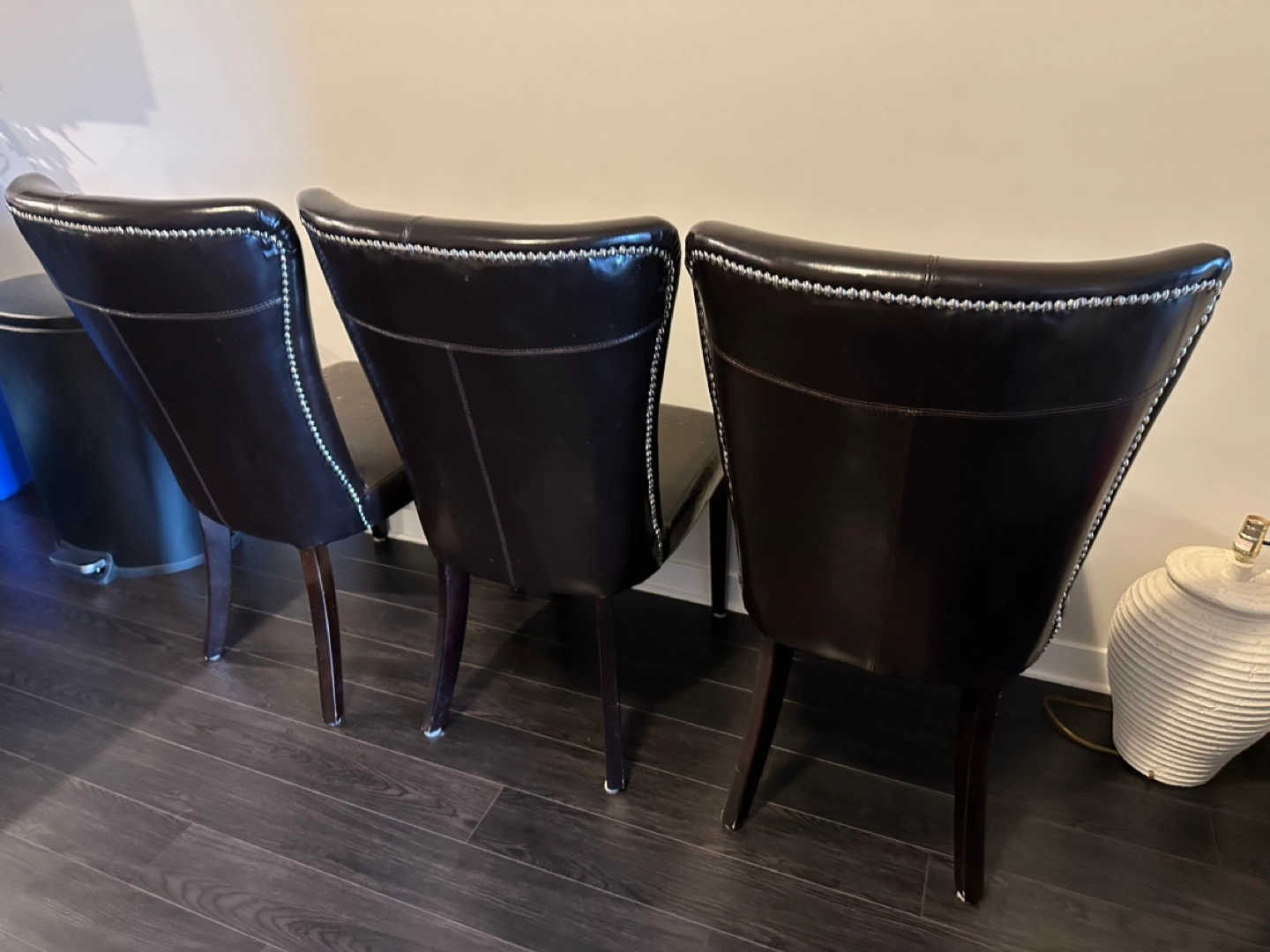 Set of three dark brown leather dining chairs. Features nailhead trim. Some wear and tear visible. Solid wood legs. They are comfy just need covers or perfect for someone who loves to DIY