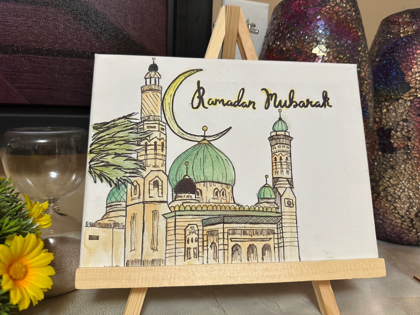 Hand-painted Ramadan Mubarak canvas. Features a detailed illustration of a mosque under a crescent moon. Small canvas, perfect for display on a tabletop easel. Comes with a mini wooden easel.