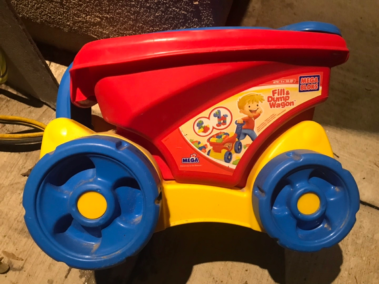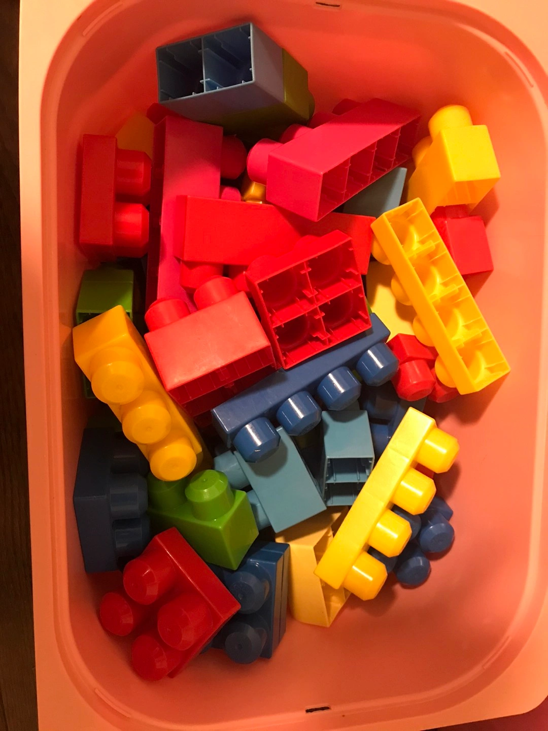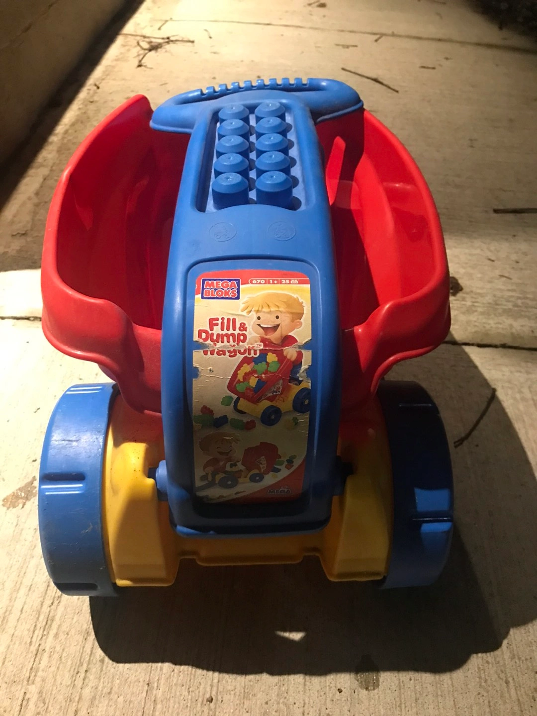 Box of Large Lego pieces - safe for children 1+ Adding to it a pull wagon. It seems there are more than 25 lego pieces- I believe we bought an additional set at some point, but have not counted them. If you Google it, sells at Giant Tiger for $30+tax