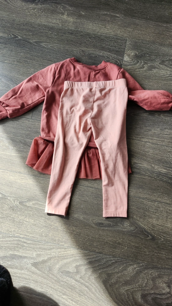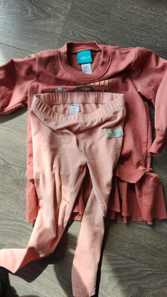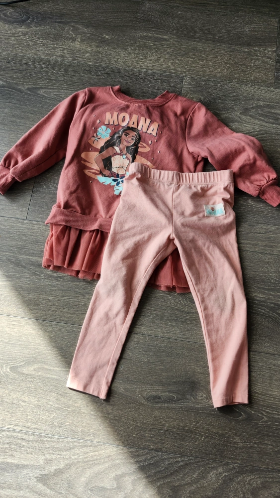Adorable Moana-themed outfit for toddlers. Features a mauve sweatshirt with Moana graphic and a pair of coordinating pink leggings. Soft material, perfect for playtime or lounging.