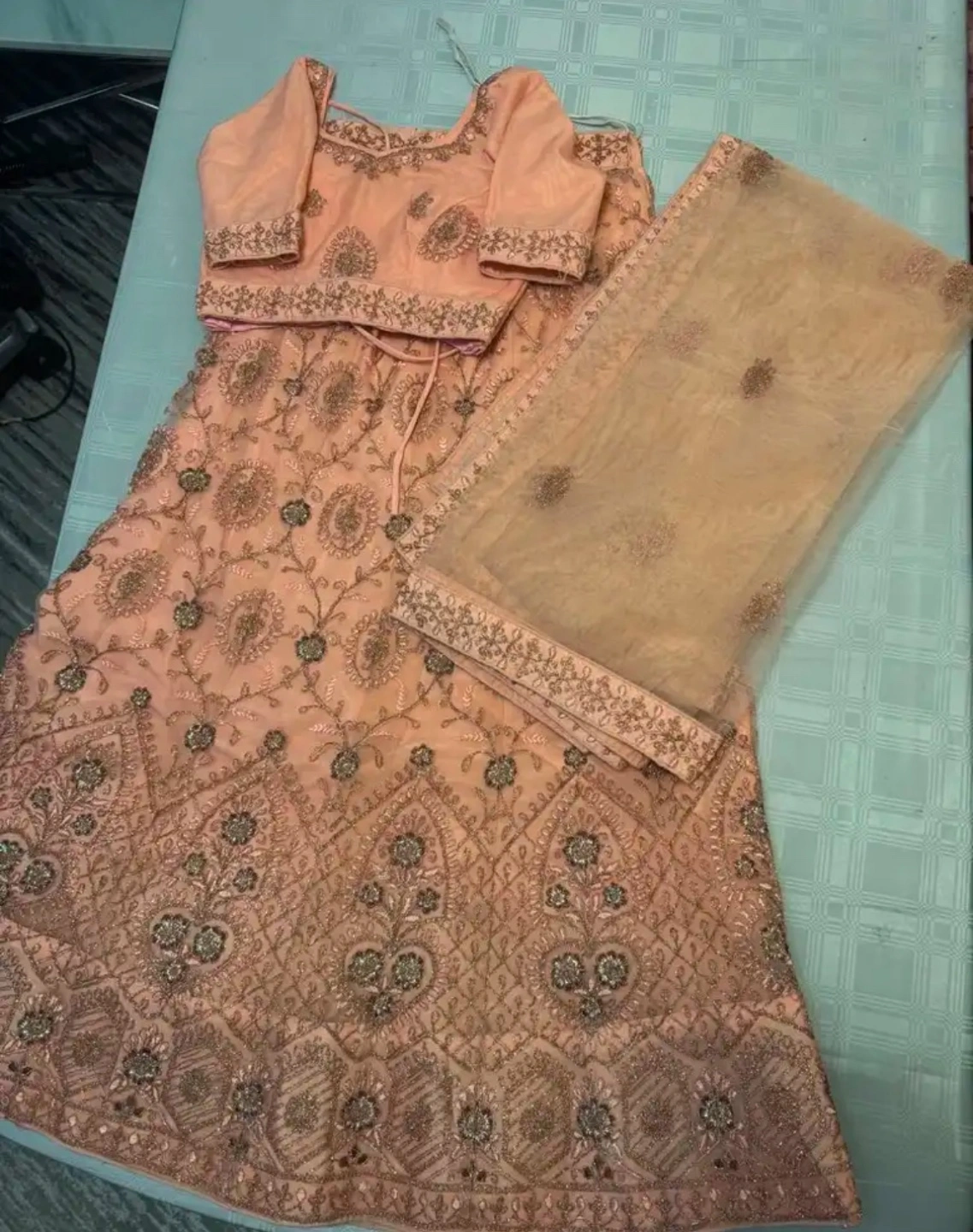 Beautiful peach lehenga choli. Intricate embroidery. Includes matching dupatta. Gorgeous for any special occasion.