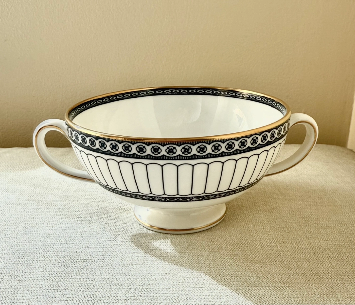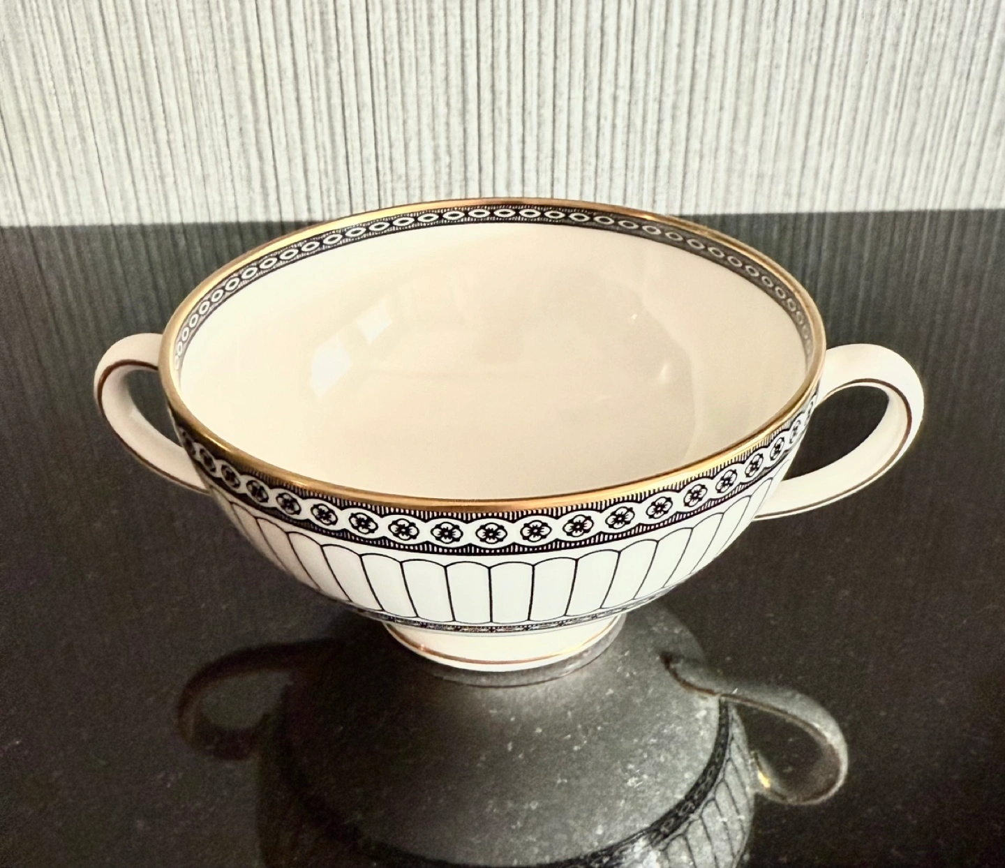 A beautiful Wedgwood footed soup bowl in the Mid-century Black Colonnade pattern. Very elegant and classic.