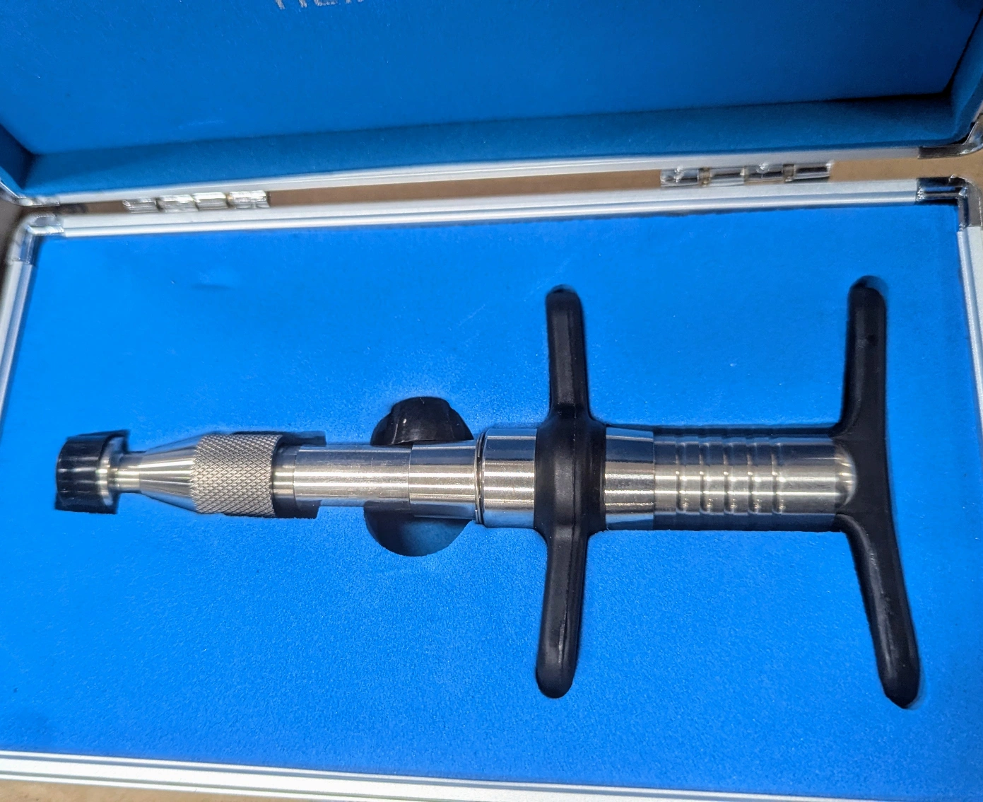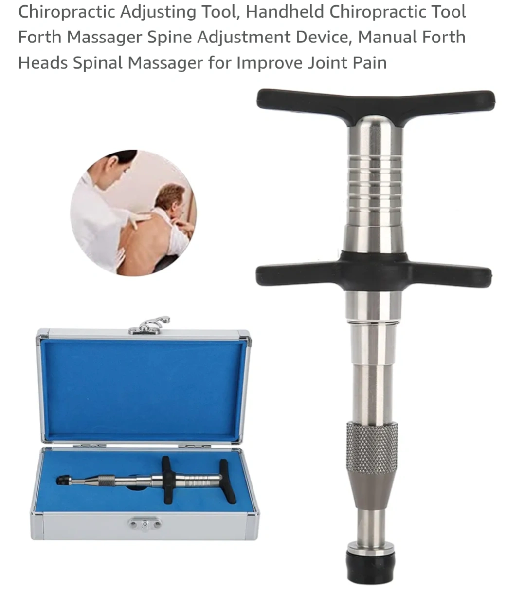 Handheld chiropractic tool. Manual forth heads spinal massager. Spine adjustment device. Improve joint pain. Comes in aluminum carrying case.
